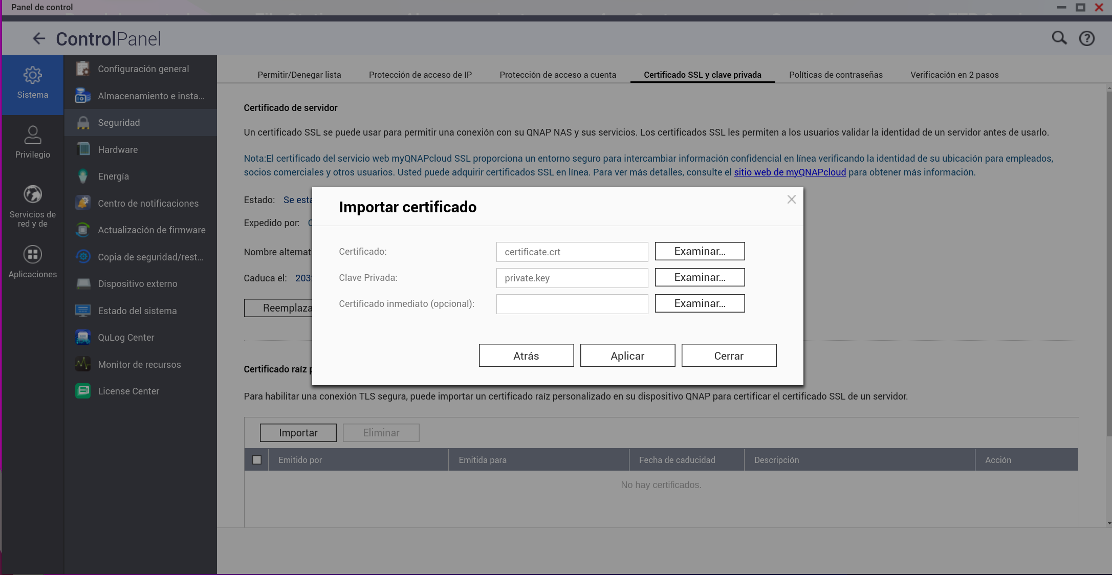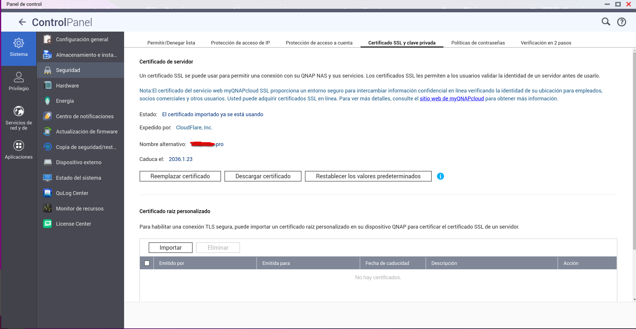 NO PASA NADA, el motivo es porque cómo tenemos iniciada la sesión en el nas con el certificado antiguo al sustituirlo por el de Cloudflare nos obliga a RECARGAR LA PAGINA, al hacerlo podemos ver que el certificado de Cloudflare se ha instalado perféctamente: