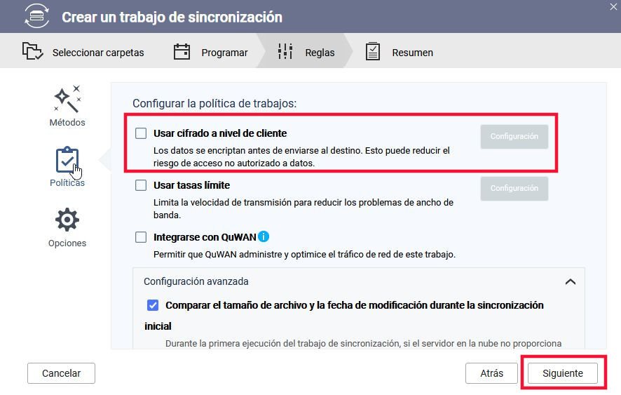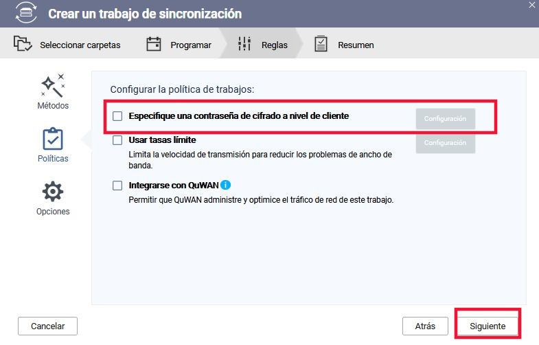 Luego el la sección de "Políticas", podemos activar el cifrado desde el lado del cliente QNAP.