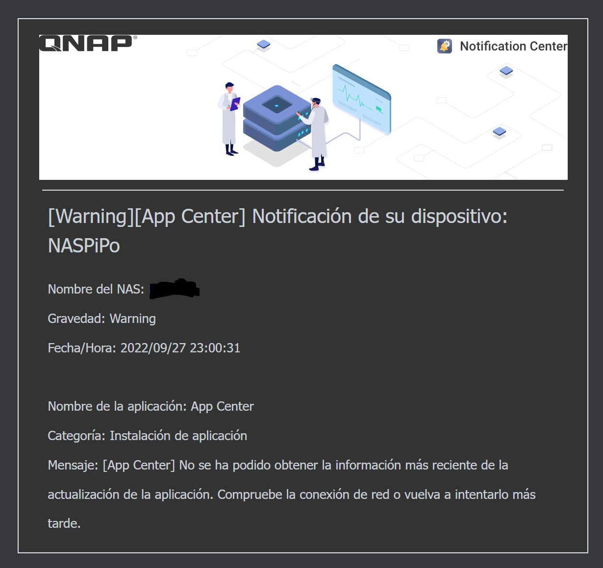 me cogio de vacaciones y perdi el acceso a la nas, desde entonces empece a recibir el mensaje de que algo fallaba, al llegar a casa actualice el sistema y reactive mycloud, todo funciona correctamente pero no dejo de recibir el siguiente mensaje todos los dias.