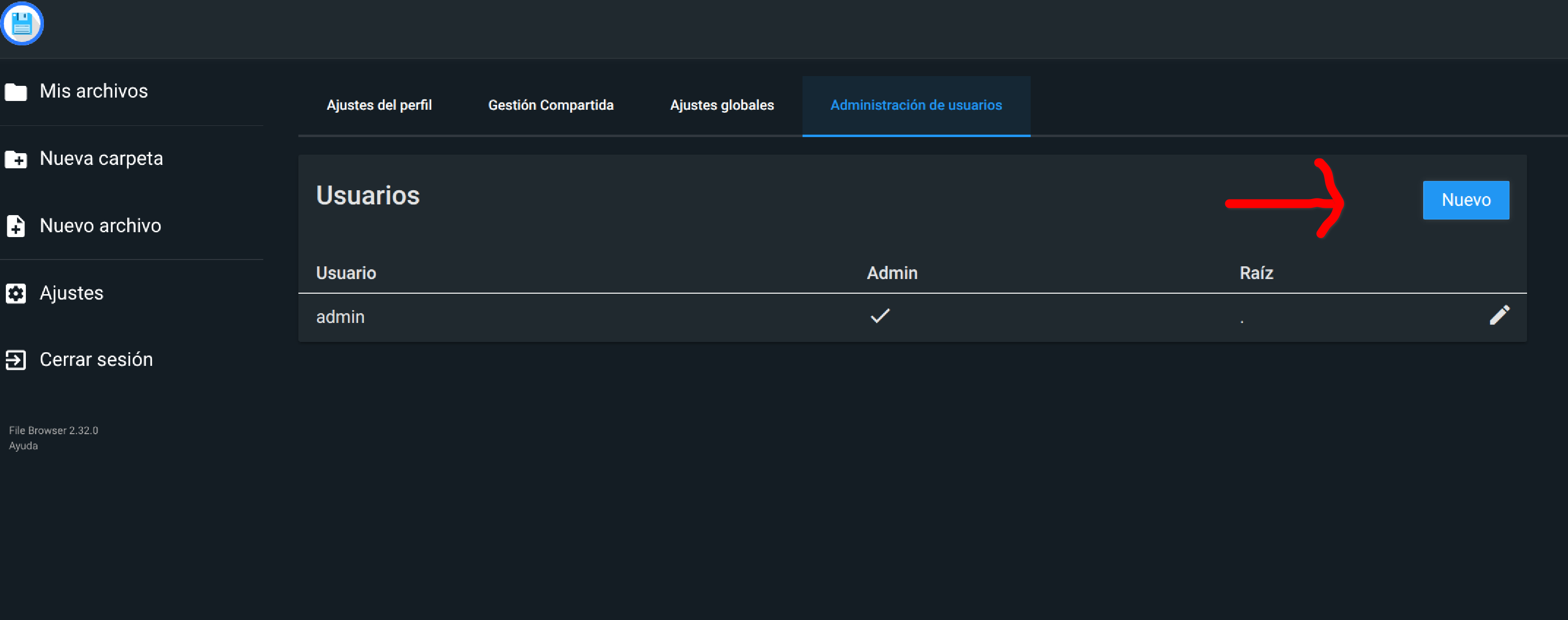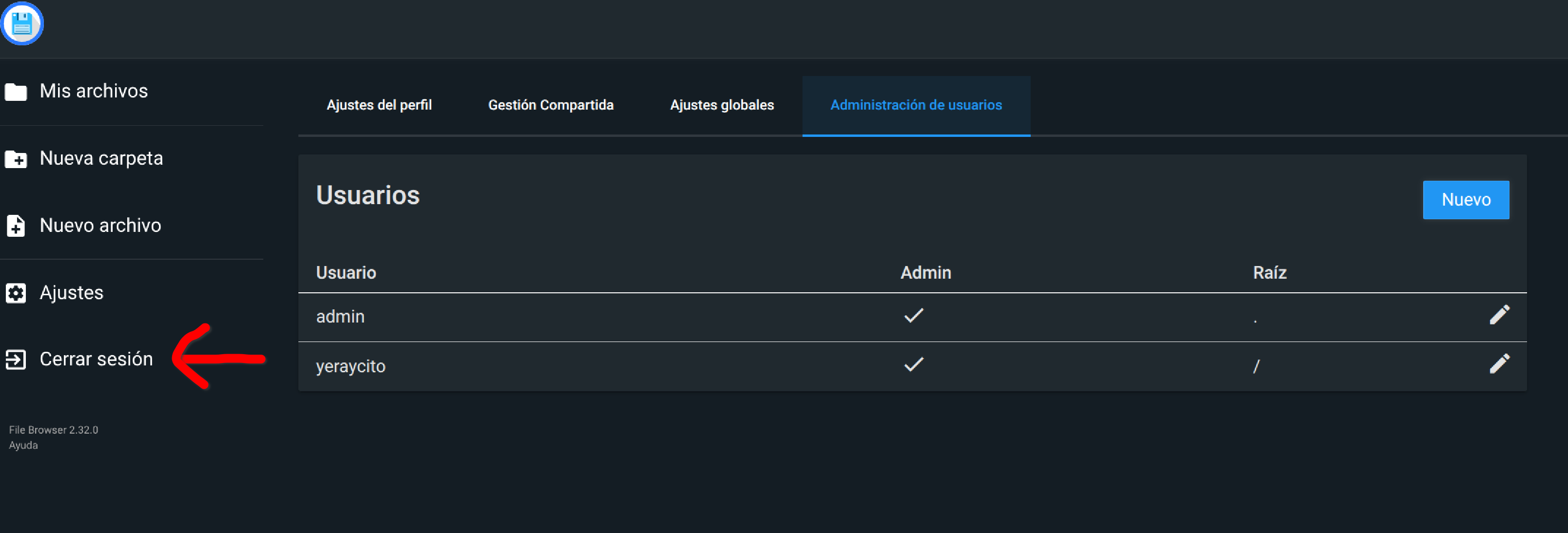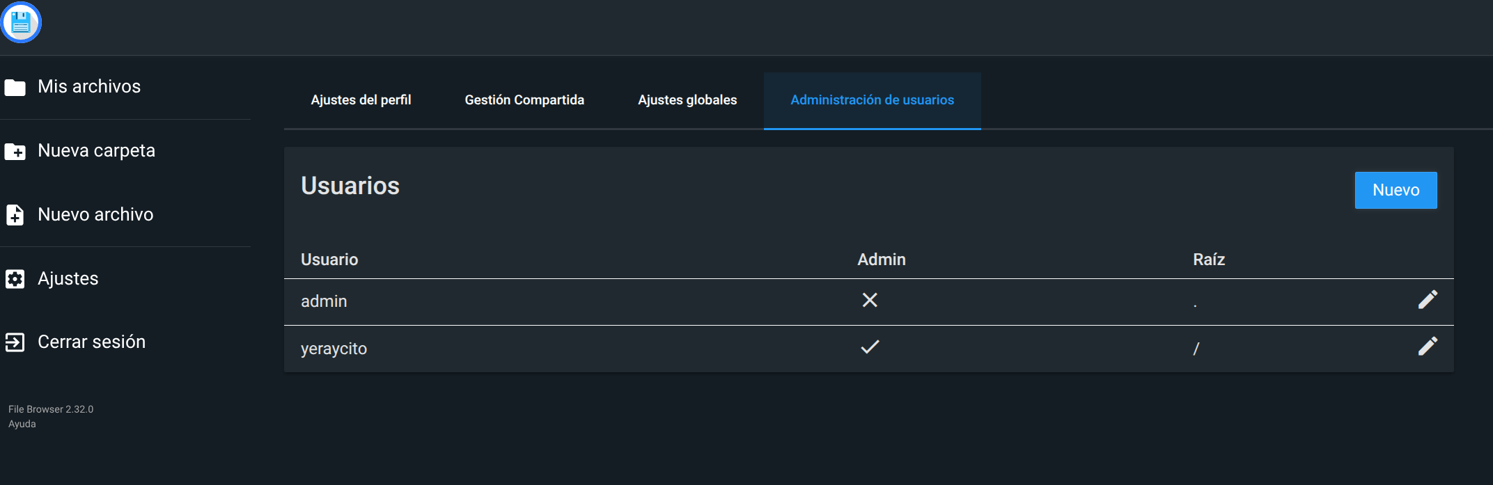 Volvemos a acceder a File Browser pero esta vez con el usuario administrador que acabamos de crear. Hecho esto volvemos a acceder al apartado de la configuración relativa a los usuarios y editamos el usuario admin que viene por defecto.