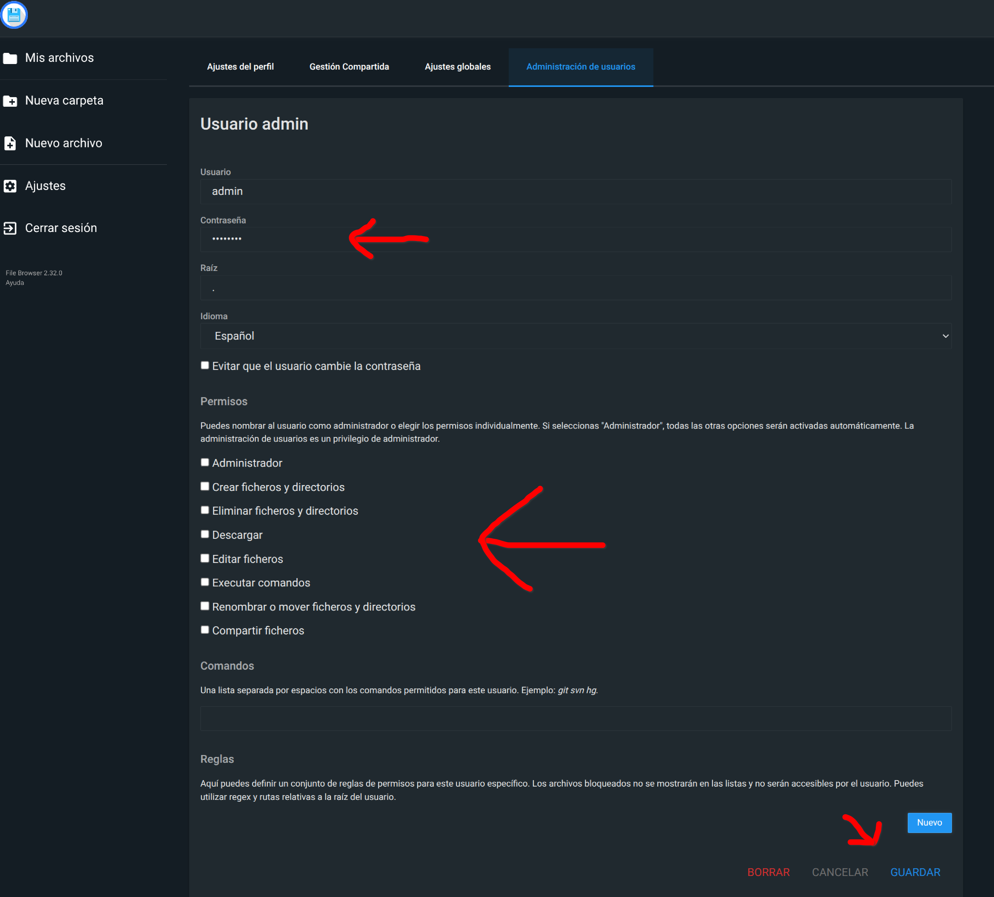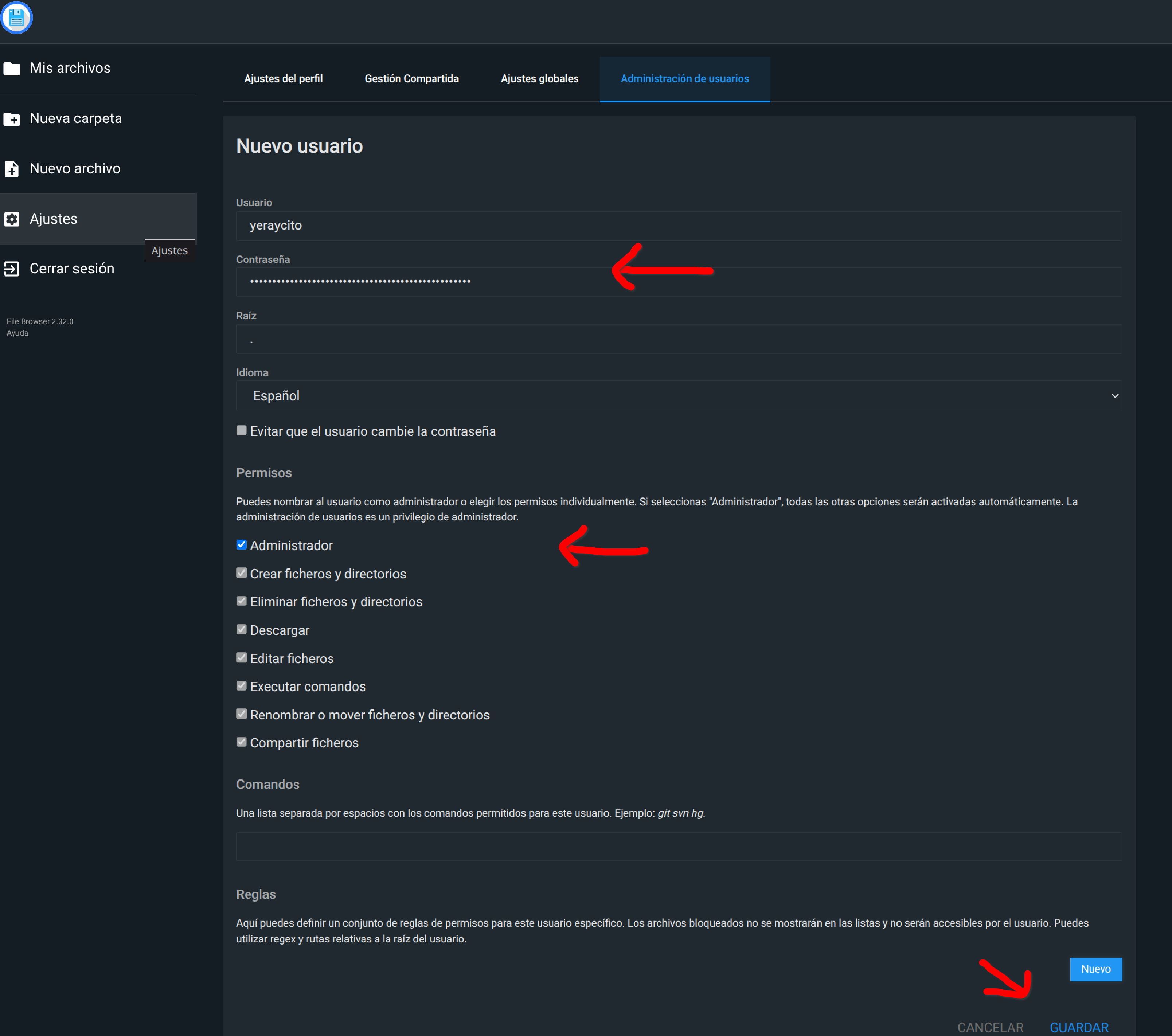 Le ponemos un nombre de usuario + contraseña, le damos permisos de Administrador y abajo del todo guardamos los cambios: