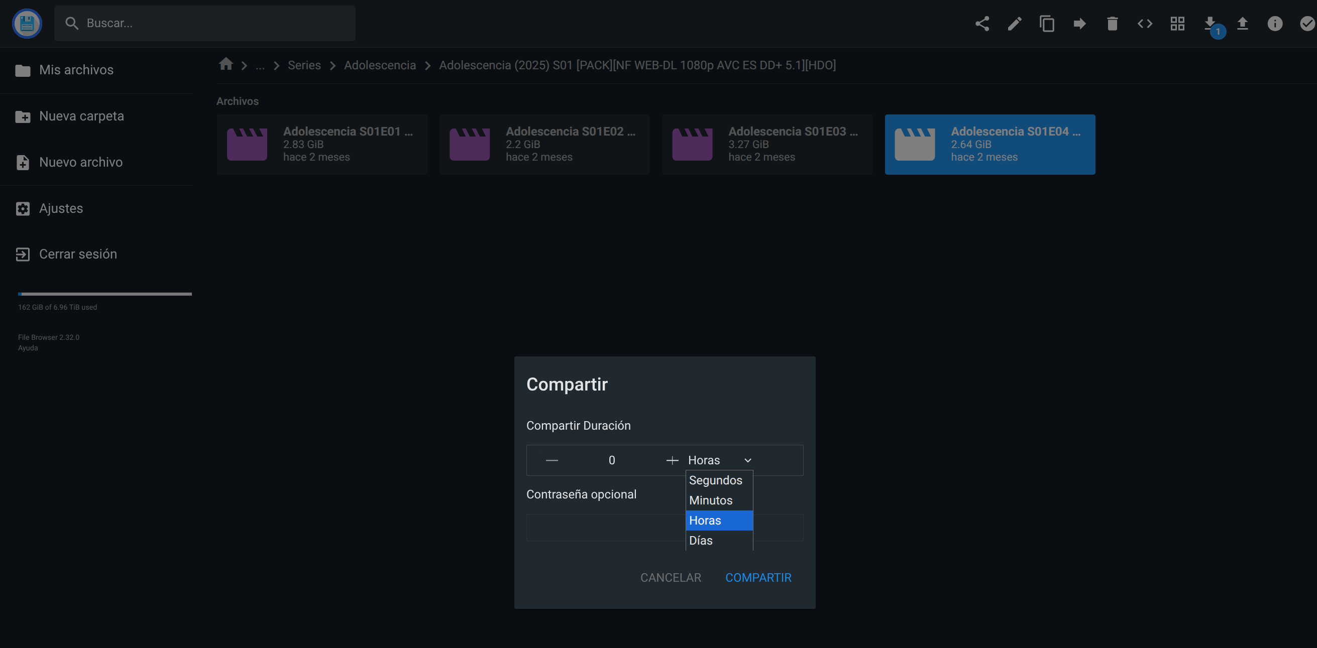 Escogida la carpeta o archivo que queramos compartir podemos configurarle una duración determinada a esa compartición así como también si queremos una contraseña para permitir su descarga por parte de quien hayamos compartido el enlace de compartición: