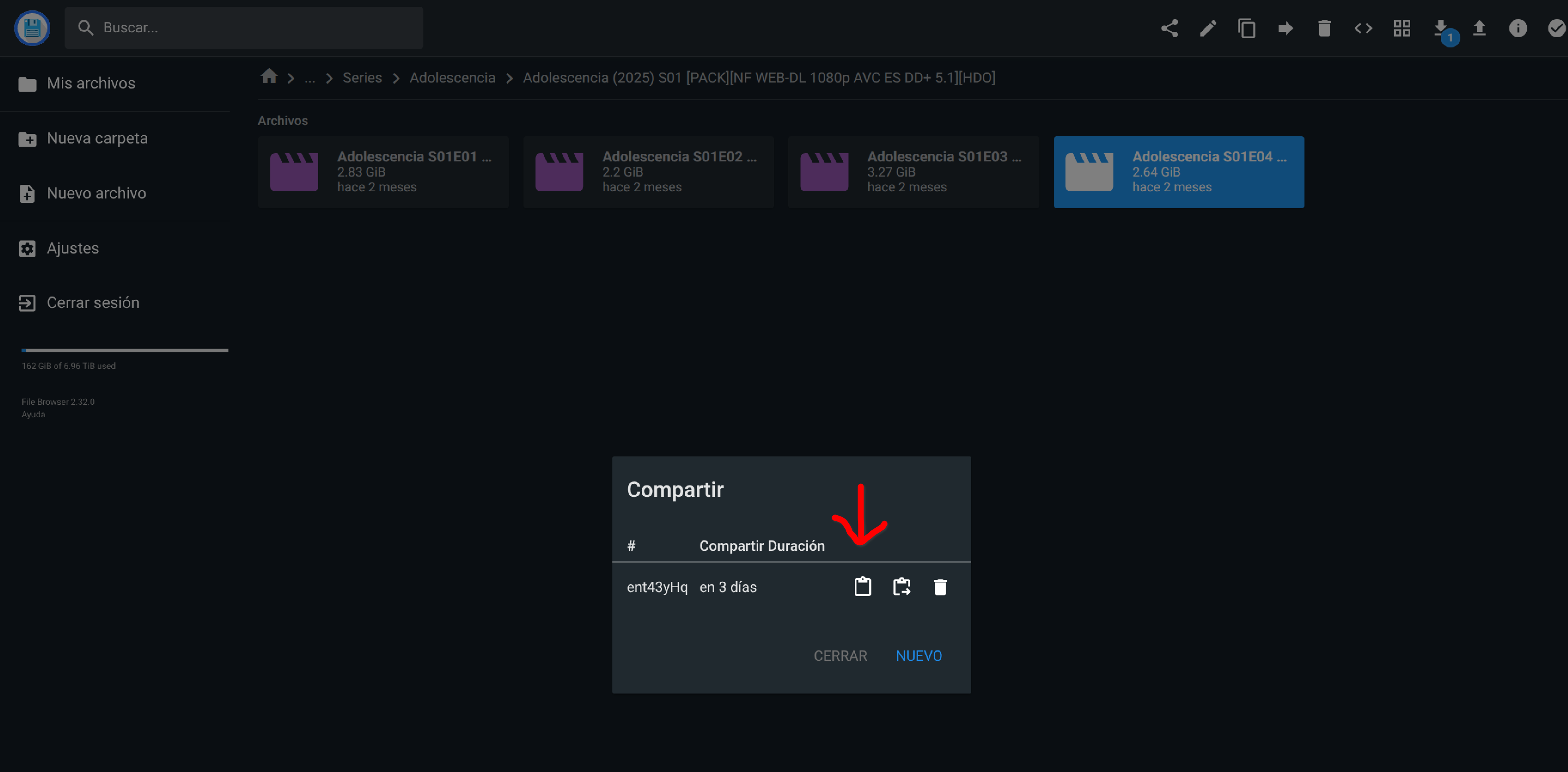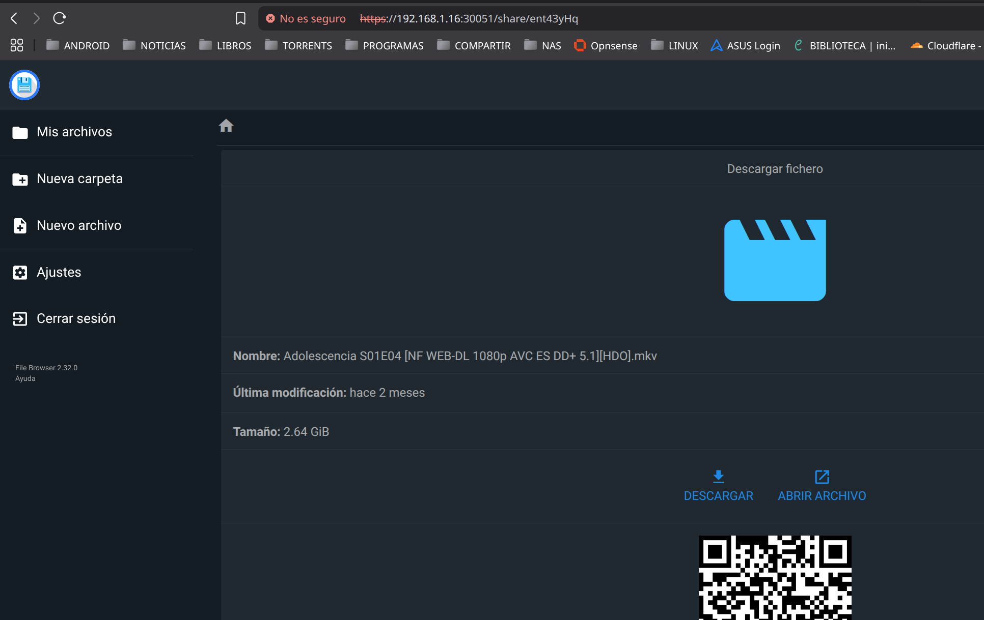 Al estar el contenedor únicamente accesible en la red local el enlace de compartición que se genera es del tipo ip local de acceso al nas + puerto File Browser + share + token quedando de la siguiente forma: