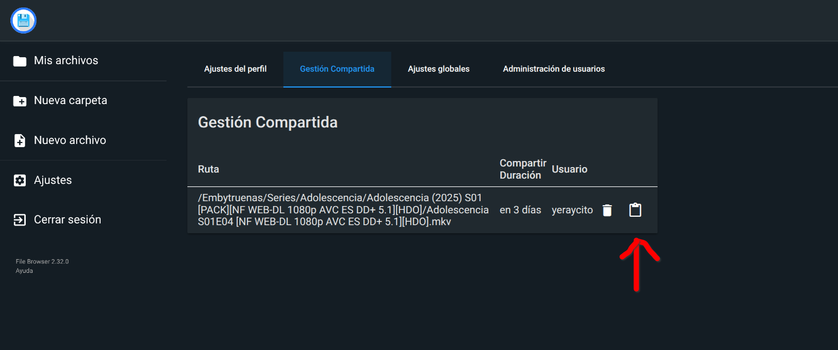 Los enlaces de compartición que creemos los podemos ver en el apartado correspondiente de la configuración de File Browser, también podemos copiar el enlace de compartición desde ahí: