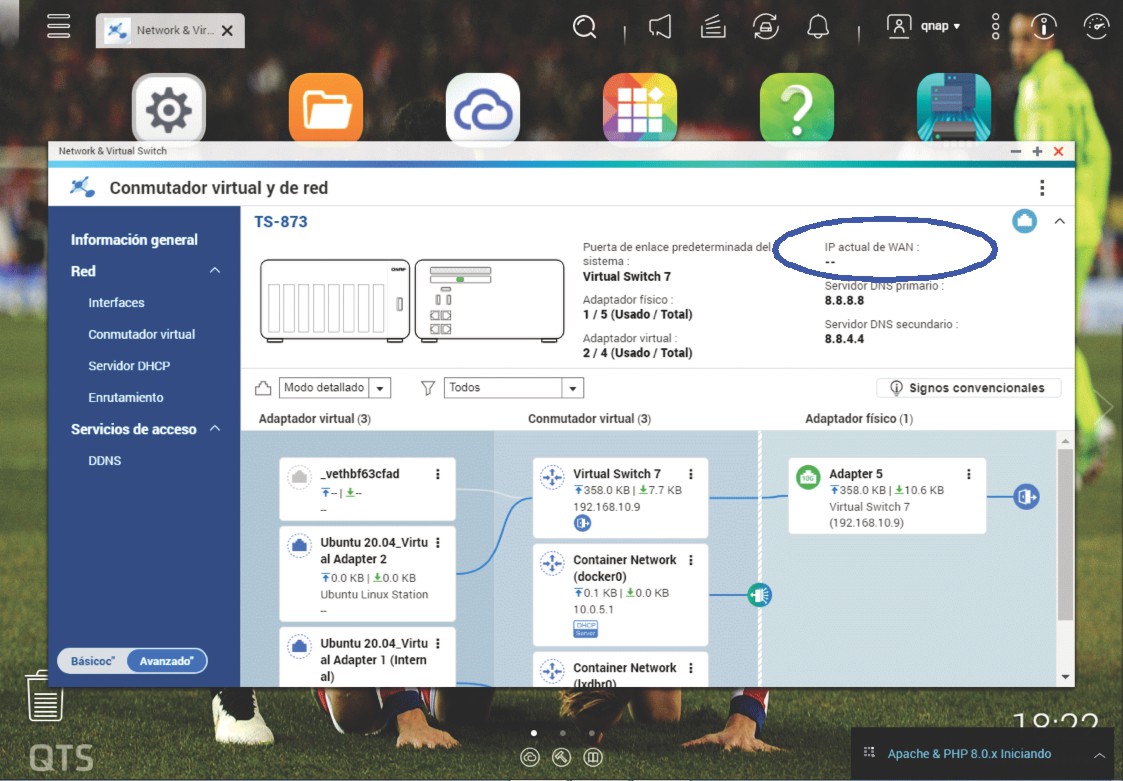 Cuando entro en la app del comuntador virtual y de redes aparece como que no adquire la ip de wan (la pública). No sé si es un problema del router o del NAS o de ambos pero me estoy volviendo loco. La unica forma de solucionarlo es reiniciar el NAS, pero es un rollo, claro.