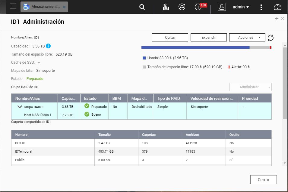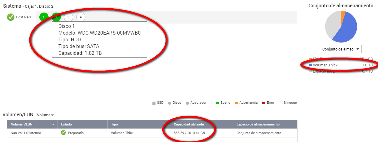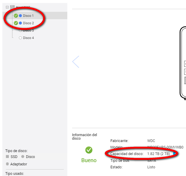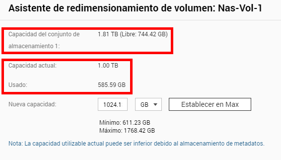 Según la calculadora de la página de QNAP, con dichos discos y dicho RAID, debería obtener un espacio disponible de 2 Tb, pero realmente no tengo más que 1 Tb.