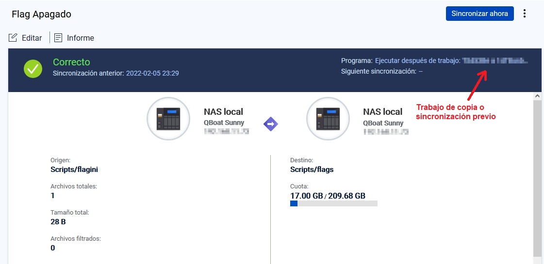 Pegas de este sistema, si la tarea de sincronización de datos no encuentra a la nas origen de datos, esta falla y no lanza tarea encadenada para apagar la nas.