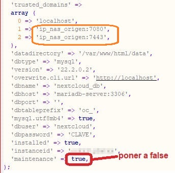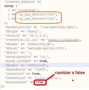Ahora editamos el archivo /share/DockerData/nextcloud-mariadb/config/config.php para poner fuera de mantenimiento el contenedor y para actualizar las ips permitidas. Ya que se supone que la nas destino tienen una ip distinta de la original (si están en redes distintas puede ser que sean coincidentes)