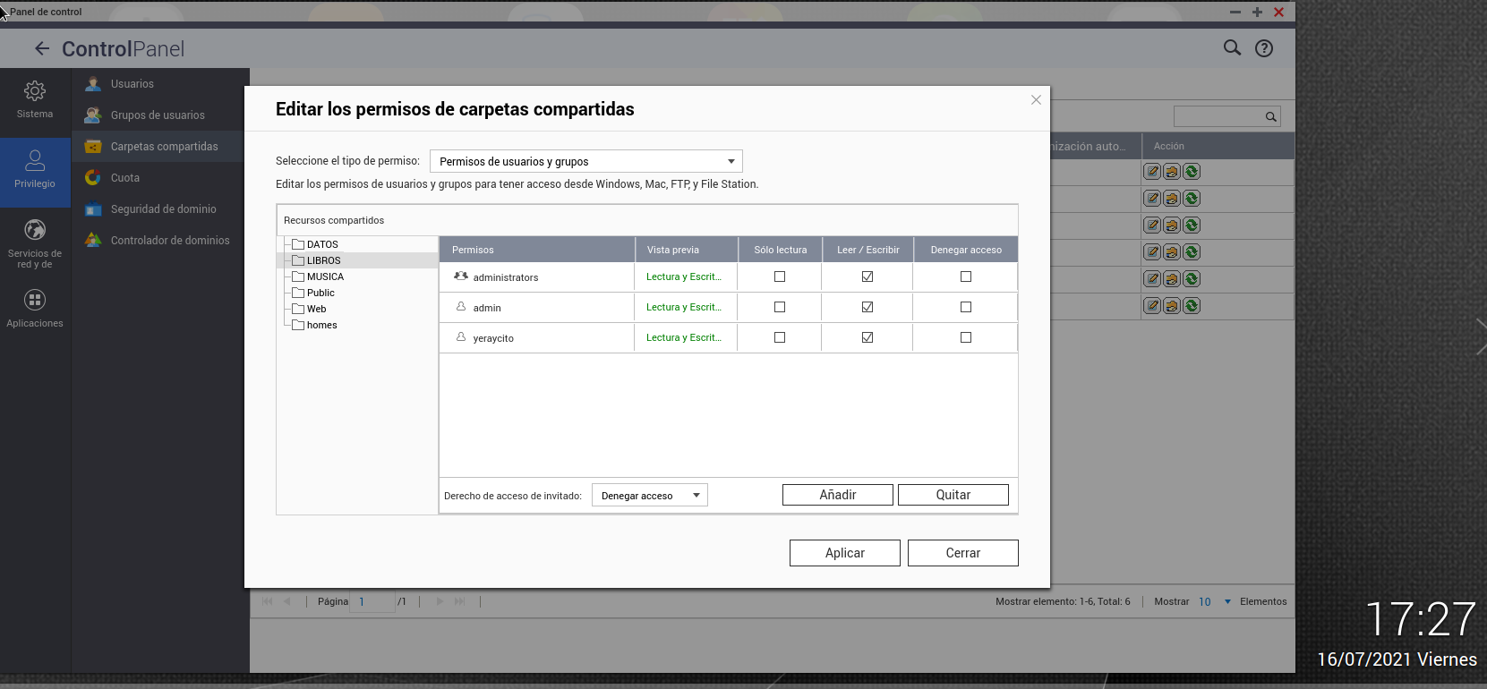 En cuanto al tema de los permisos. En los dos años que tiene este post puedo afirmar, sin lugar a equivocarme, que he instalado y desinstalado este programa unas 30 veces siempre sin ningún problema. La mayoría de las veces, todas anteriores al último ransomware que afectó a los nas, siempre las hice con una única cuenta admin habilitada en el nas y con los permisos que trae el nas " de serie ". Desde el último ransomware, o sea, hace unos pocos meses, deshabilité en mi nas la cuenta admin y creé otra cuenta que es con la que accedo al nas y esta última cuenta la creé también con los permisos " de serie ". En los últimos comentarios que se pueden ver en este post con éste último sistema de cuentas de usuario he realizado 3 instalaciones de calibre-web y en ninguna de ellas he tenido ningún problema. Por éste motivo en el tutorial de instalación que tengo puesto al principio de éste post, ni en sus posteriores comentarios NUNCA he hecho alusión a ninguna configuración " especial " sobre los permisos que tengamos o debamos tener en nuestro nas para que ésto funcione. Para reafirmarme en ésto puedo decir que los que lo han instalado y han tenido a bién comentarlo en éste post tampoco se han referido a que hayan tenido problemas con los permisos en el nas. Os pongo unas imágenes de la configuración de usuarios y permisos " de serie " que tiene actuálmente mi nas.