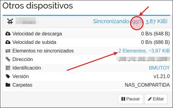 A mí alguna vez me pasó algo parecido, que no pasaba del 99% por ejemplo, de hecho ahora mismo me pasa, ni me había dado cuenta. No es que deje de funcionar Syncthing, sino que se atasca porque no puede leer ficheros, por ser ocultos, con caracteres raros,etc. Puedes ver dónde está el problema clicando en mi caso en "Elementos no sincronizados", en tu caso en "Sync Status", y se te despliega una ventana emergente con los ficheros que se atascan al sincroinizar. Muchas veces es por caracteres raros, ficheros ocultos, etc. Estoy casi seguro que así lo arreglas. Si es así, me debes una