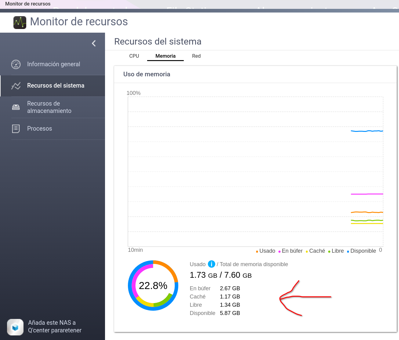 Como he dicho al principio voy a explicar como instalar Calibre-web en Container Station 3 de la manera "normal" y en la parte final de la explicación comentaré como instalarlo a través de Kata Container que, lógicamente, será opcional. Si quisiéramos instalarlo de esta última forma lo primero que tenemos que saber es que el nas tiene que tener un mínimo de 4 gigas de ram y tener suficiente memoria disponible. Una buena forma de saberlo es accediendo al Monitor de Recursos del nas:
