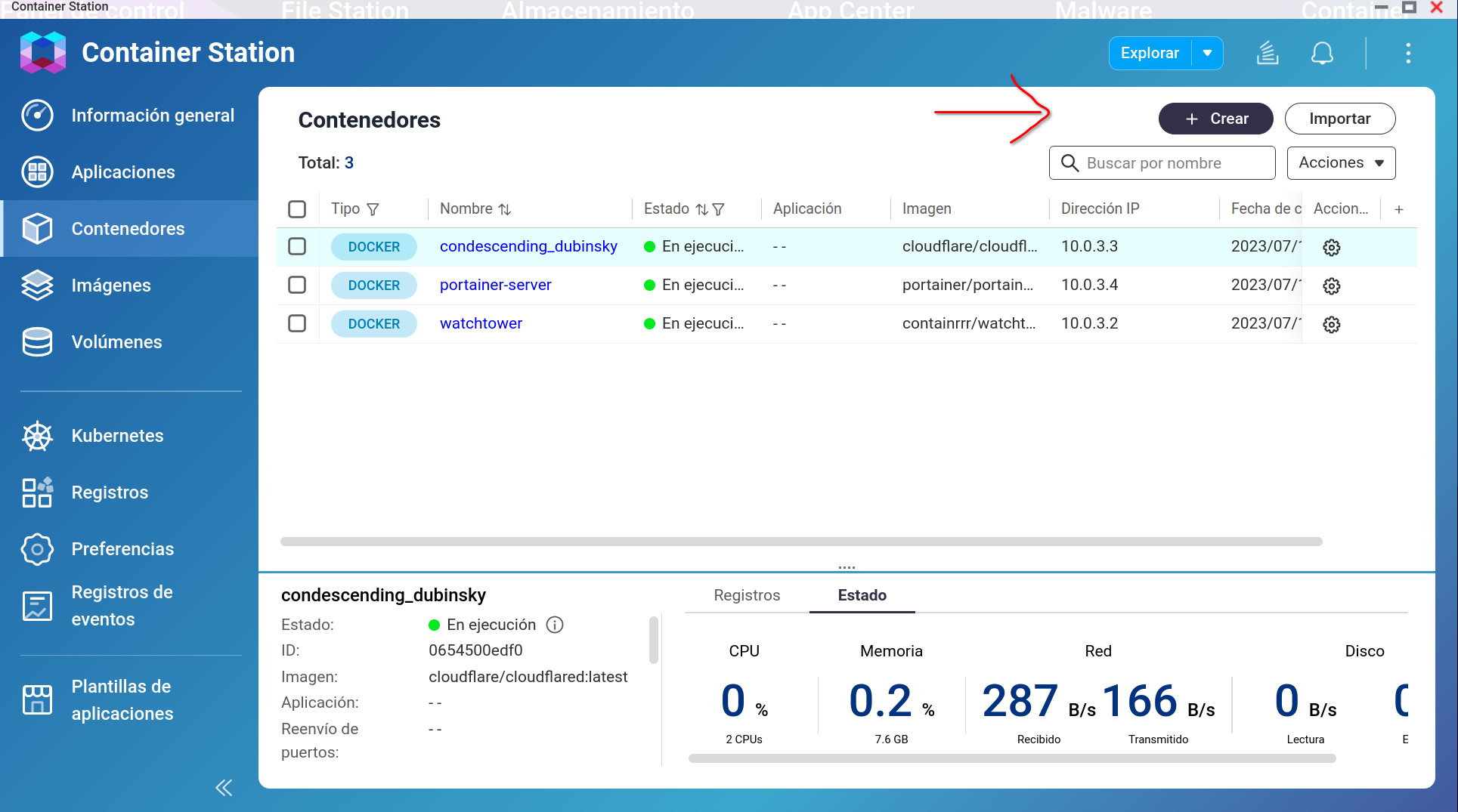 Abrimos Container Station 3 y en el apartado Contenedores le damos a Crear uno nuevo.