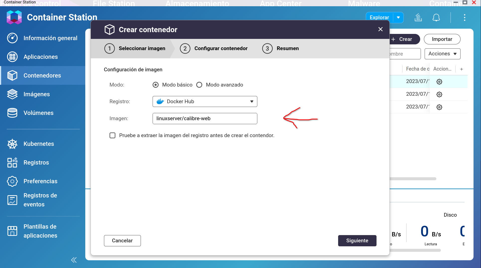 En este primer apartado de la configuración tan sólo tenemos que poner el nombre de la Imagen que en este caso es linuxserver/calibre-web