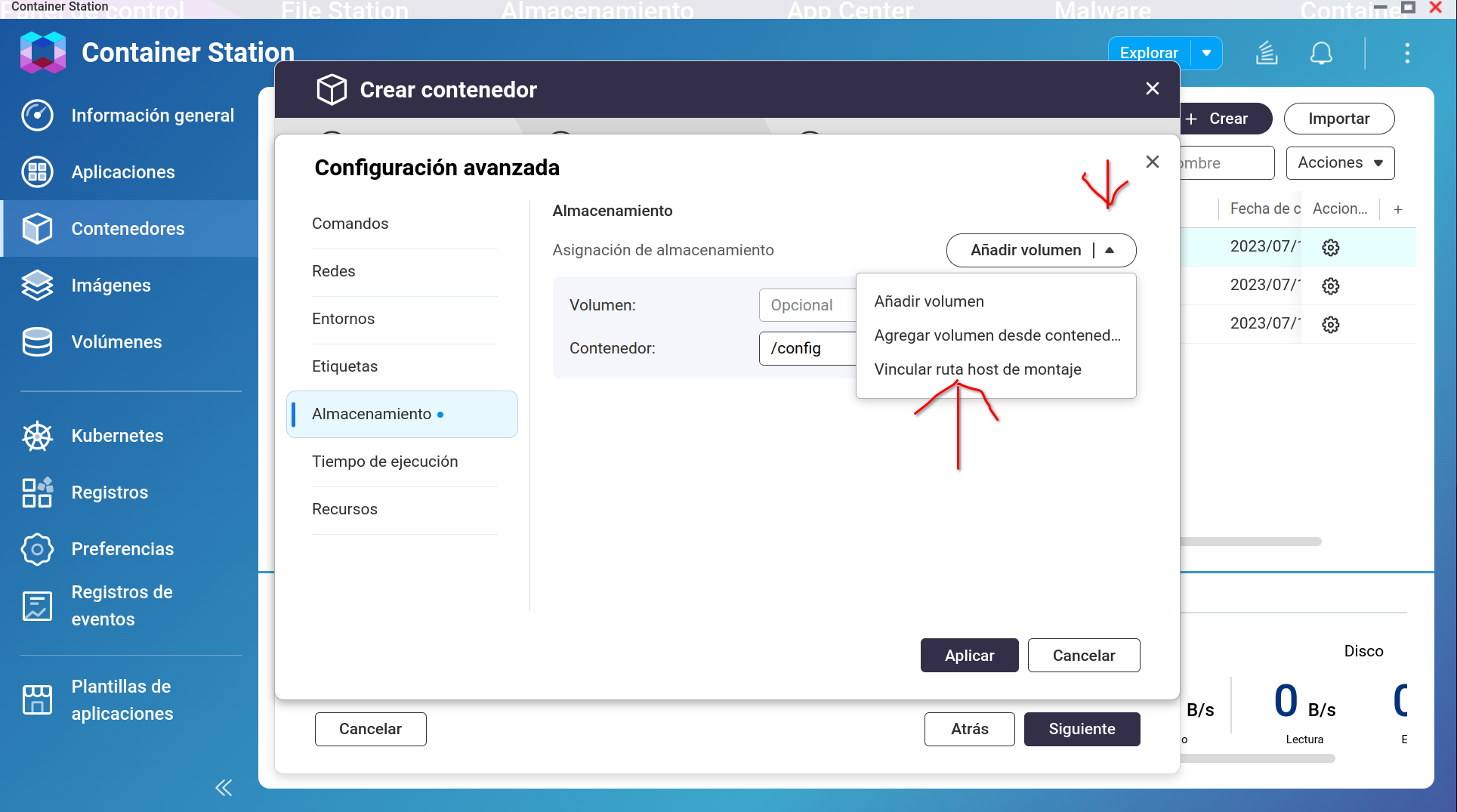 Al acceder nos encontramos con un Volumen - Contenedor con el ajuste /config que tenemos que ELIMINAR, lo podemos hacer ahora o después. Lo que tenemos que hacer ahora es darle a la flecha de Añadir volumen y en submenú que nos aparece seleccionamos la opción Vincular ruta host de montaje, al hacerlo nos quedará así: