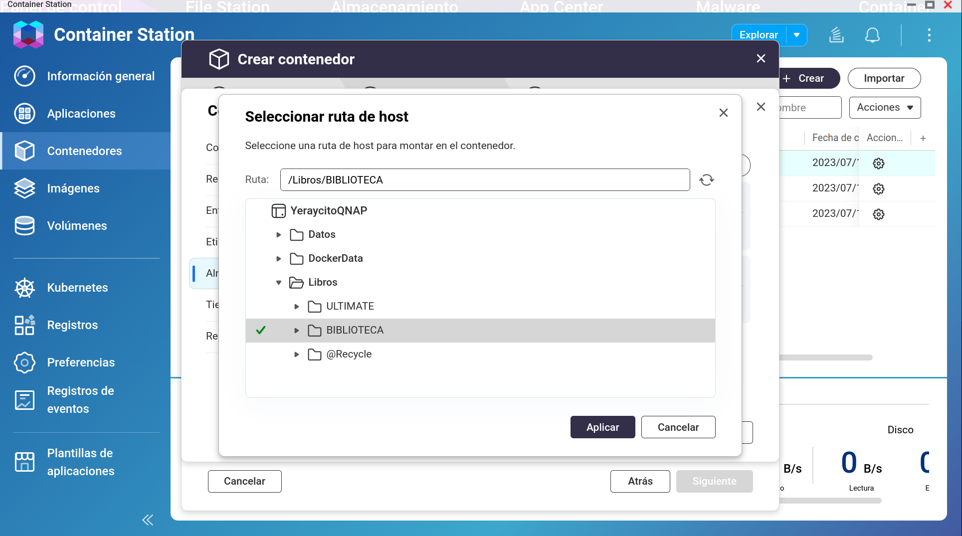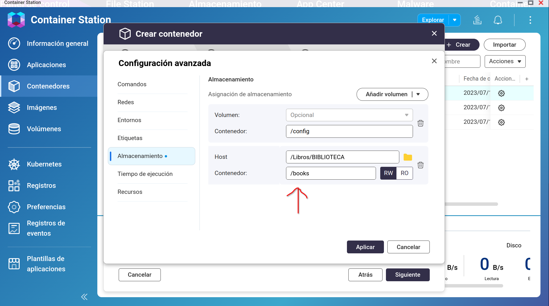 Una vez escogida la carpeta correspondiente y guardados los cambios tenemos que poner /books en el apartado Contenedor al igual que se hacía en el antiguo tutorial