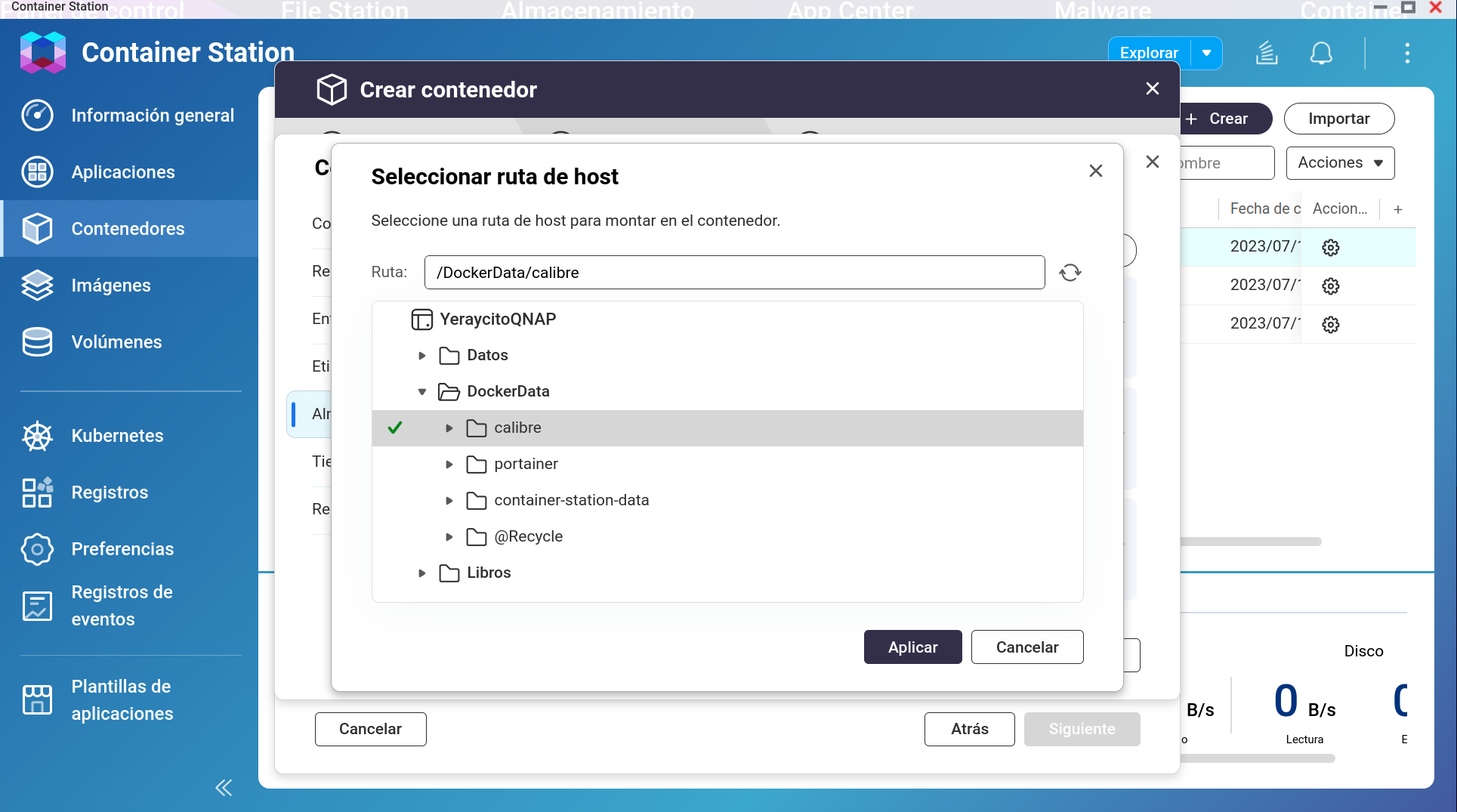 Al principio de este post, en el tutorial antiguo, explico que para que Calibre-web funcione necesita 2 carpetas, la primera la tenemos que crear ANTES de crear el contenedor que es la que sirve para guardar la configuración de Calibre-web y la segunda es, lógicamente, la carpeta del nas donde tenemos la biblioteca de Calibre. Voy a empezar configurando esta última, para ello le damos al símbolo de carpeta que nos aparece, al darle se nos muestra el directorio de carpetas del nas: