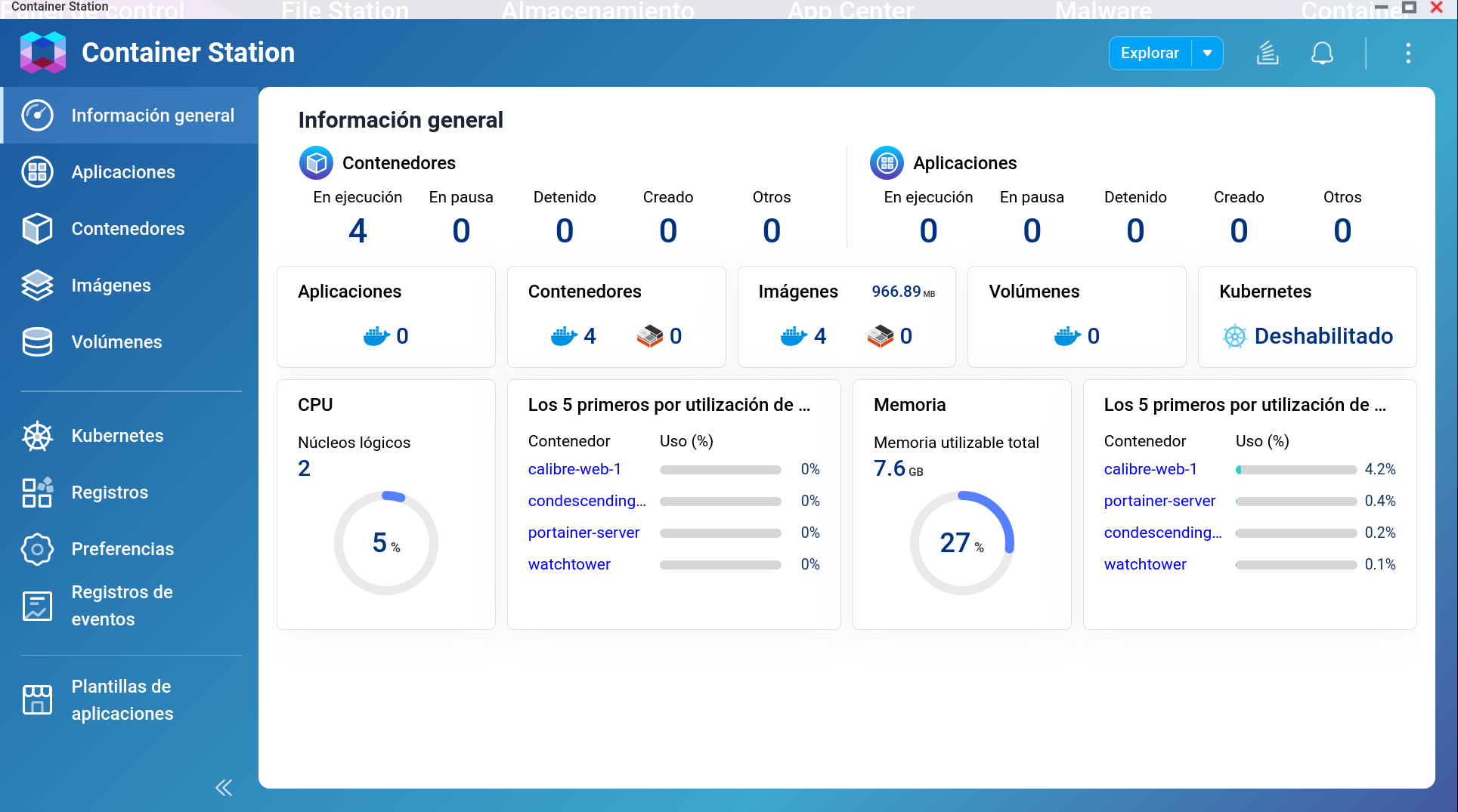 El apartado CPU se corresponde a virtual cpu y dependiendo del procesador que se tenga en el nas se pueden usar más o menos cosa que ocurre lo mismo con la cantidad de contenedores que podemos instalar en el nas a través de Kata Container.