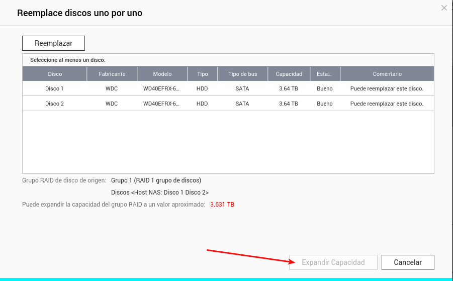 Milagrosamente, me ha habilitado la opción "Expandir", que hasta ese momento aparecía en color gris. He clicado y voilà!!!, ya tengo los 9.10Tb en el saco.