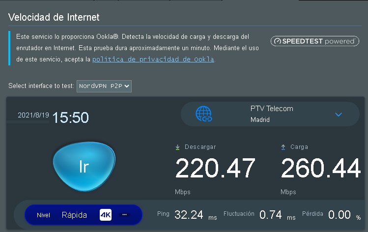 Te adjunto captura de pantalla de las velocidades del router. Vivo en Málaga por lo que he elegido un servidor de Madrid, en concreto es un servidor P2P con el protocolo UDP. Tengo contratado fibra 600Mb simétrica con Pepephone. La VPN tiene activado el killswitch. Con estos datos creo que no te faltará información y si quieres saber algo más sobre el router será un placer.