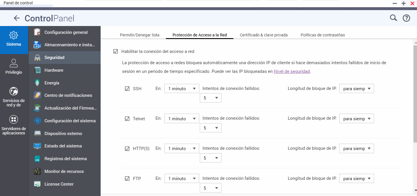 -Activar protección de acceso a redes desde el panel de control - sistema - seguridad - pestaña protección de acceso a la red (poner en longitud de bloque: para siempre)