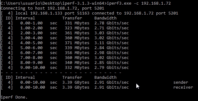 Y finalmente he probado a hacerlo sólo con las tarjetas de red 1GbE (MTU 1500) en ambos y me ha tardado 27 segundos por el script (2 seg mas que por red 10GbE)