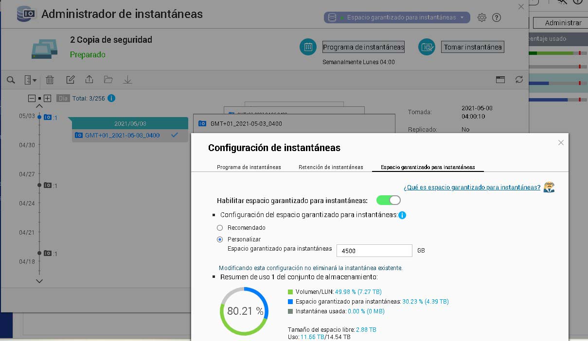 En su día, para poder hacer instantáneas, habilité el espacio garantizado y programé hasta un máximo de cuatro instantáneas (todas del volumen 2). El caso es que el espacio garantizado lo puse en un 10% (1,45TB) pero no me figura que las instantáneas estén en el espacio garantizado porque me aparece que el espacio usado es 0MB. No entiendo donde se han almacenado las instantáneas y si es normal o he hecho algo mal.