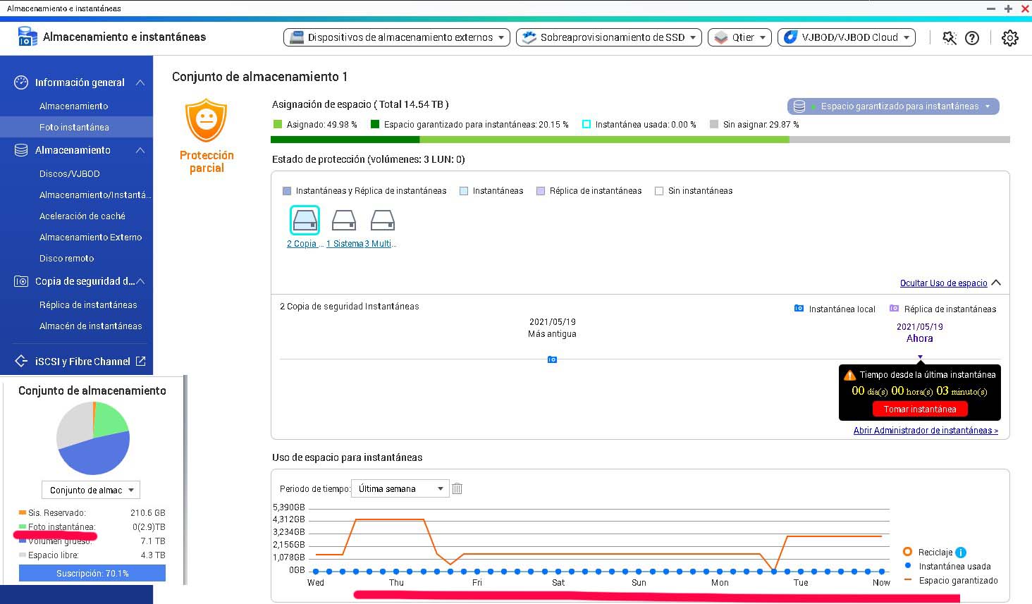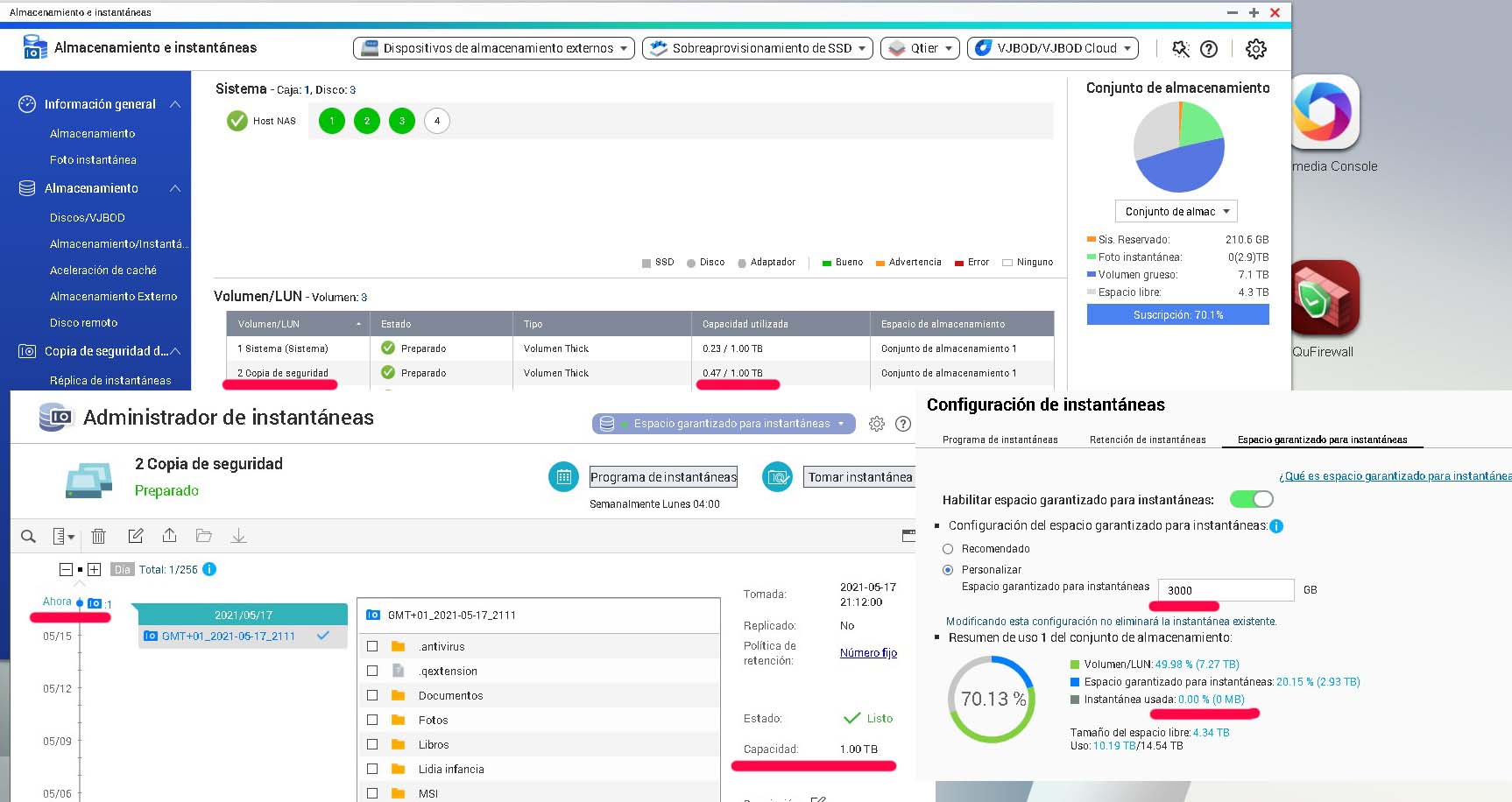 (12-05-2021, 03:27 AM)yeraycito Wrote: Hola. Según dices tienes un único conjunto de almacenamiento con espacio sin asignar y con varios volúmenes. Al reservar espacio de almacenamiento para instantaneas, y aunque no lo hicieras, ese espacio, y las instantaneas, se guardan en el conjunto de almacenamiento, no en los volúmenes. En la imagen que has puesto parece que una única instantanea ocupa 1 TB. En esa misma imagen se ven que tienes 4 instantaneas hechas que a 1 TB cada una dan un resultado de 4 TB en su conjunto. Tu tienes reservado para instantaneas un 10 % del conjunto de almacenamiento, 1,5 TB más o menos para hacerlas. Cómo tienes 4 TB de instataneas hechas sobrepasa con mucho el espacio reservado que tienes asignado. Normálmente cuando esto ocurre el nas echa mano del espacio no asignado del conjunto de almacenamiento para hacerlas. Lo malo es que esto no es muy fiable y es posible que sea por eso que no te informe del espacio que ocupan aunque reálmente las tengas hechas. En teoría estarían hechas en el espacio asignado a las instantaneas en el conjunto de almacenamiento y, como digo, habrá echado mano del espacio sin asignar que tienes en el conjunto de almacenamiento. Resumiendo, problema no hay, las instantaneas están hechas. Cosméticamente hablando no está bien porque el software de Qnap dice que esas instantaneas no ocupan ningún espacio y eso no es normal. Soluciones: