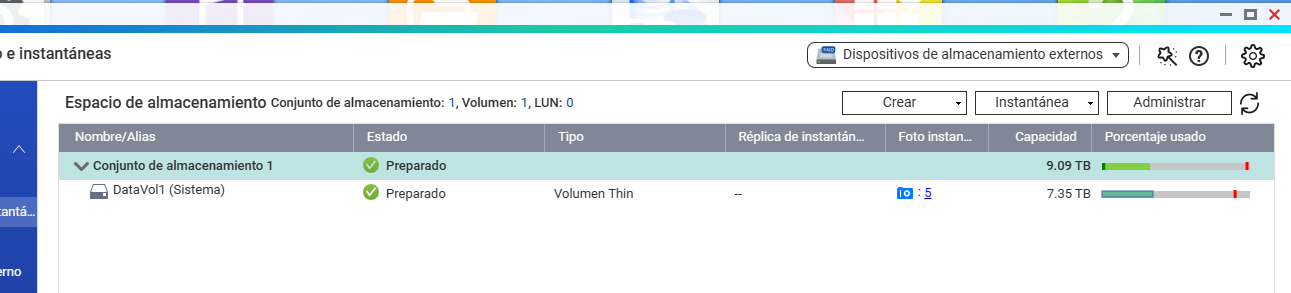 - Data Vol 1 (sistema) : preparado..............volumen Thin...........4 instantáneas.......7.35 tb.