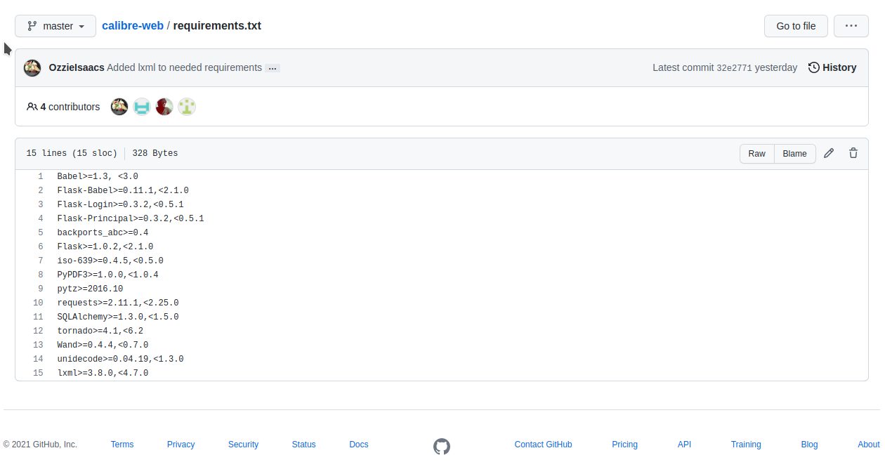 Todo esto ya lo había explicado en anteriores comentarios mios en este post. Ahora explico lo IMPORTANTE. Ayer el desarrollador de Calibre-web ha introducido UN NUEVO COMPONENTE NECESARIO para que el programa funcione. Os pongo una imagen de los componentes que utiliza Calibre-web a dia de hoy en la que se puede ver el nuevo componente lxml en la fila 15.
