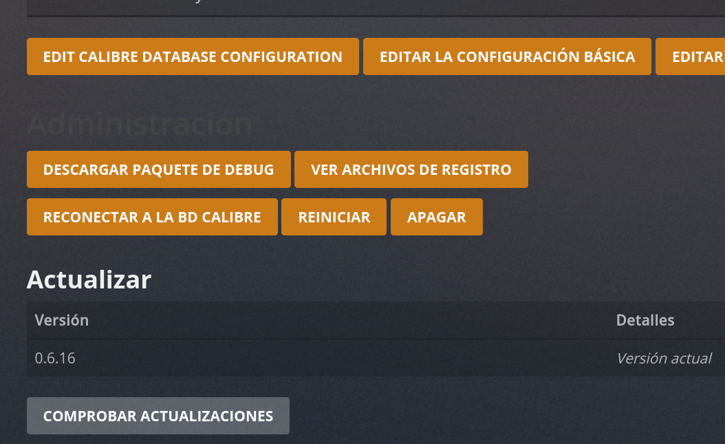Tras poco más de una semana nueva actualización estable 0.6.16 que soluciona algunos errores graves para ciertas funciones del programa cometidos en la última actualización estable. Por suerte, y para los que lo tengáis ya instalado en ésta ocasión NO es necesario desinstalar para actualizarlo. Tan sólo hay que entrar en la configuración de Calibre-web y darle al correspondiente botón de Comprobar Actualizaciones: