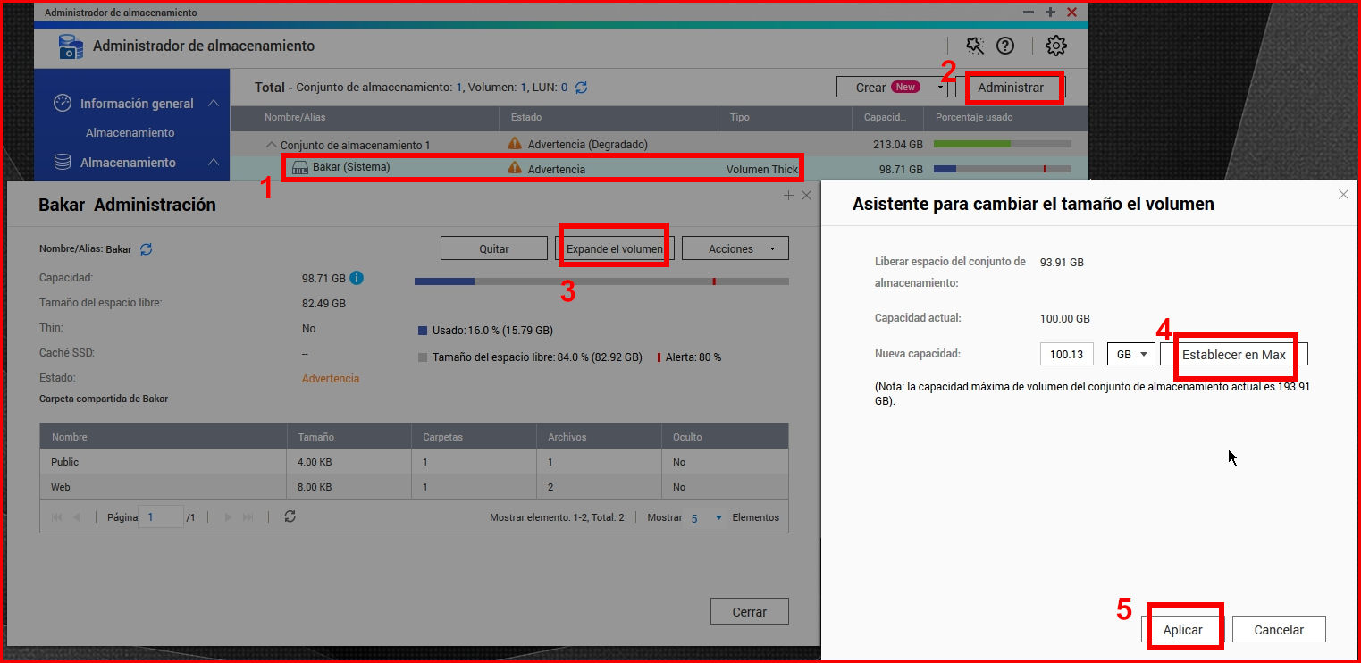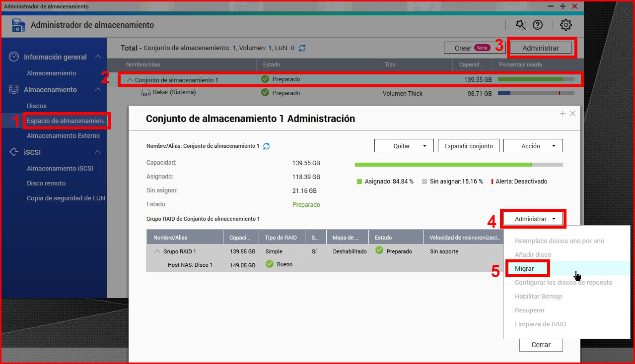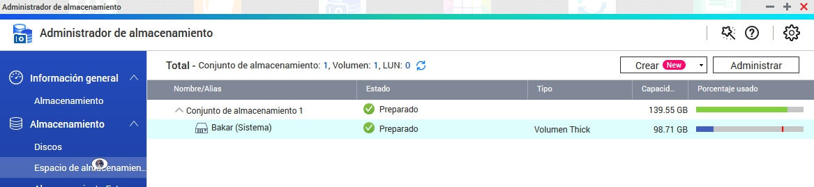 Ahora mismo tenemos asignados 118,39 GB y una capacidad de 139,55. Es decir QTS aunque reconoce el disco como e 232,89 GB, no deja expandirlo.