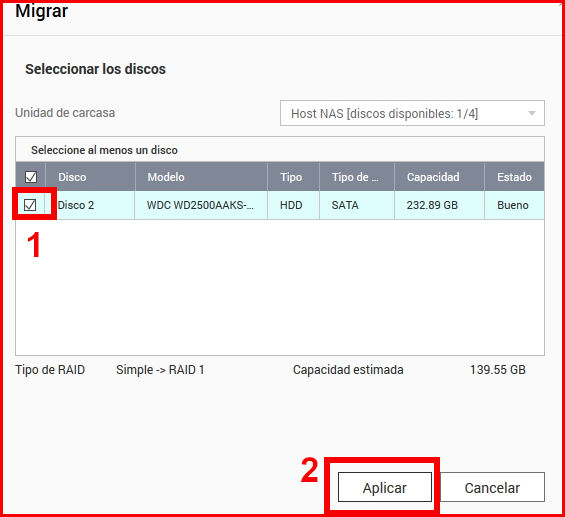 Queremos iniciar la QNAP con un disco de 160GB y acabar migrando todo a un nuevo disco de mayor capacidad de 250GB.