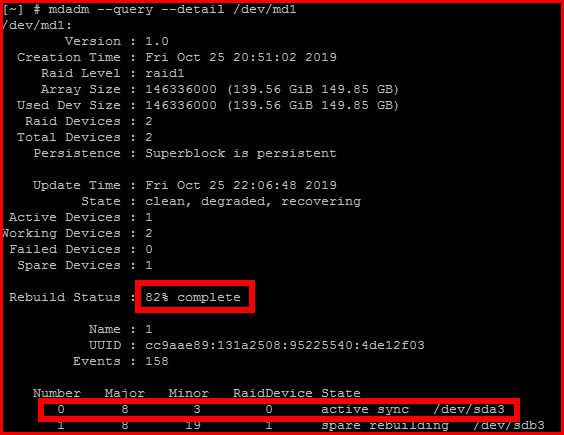 Que está reconstruyéndose (rebuilding) el /dev/sdb3 y que vamos a un 82%