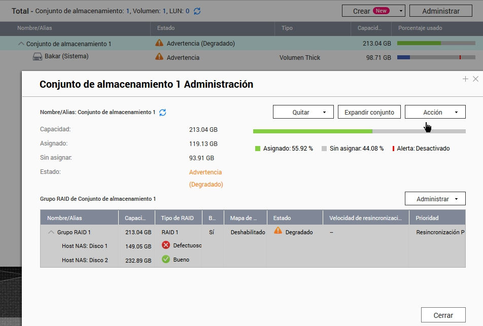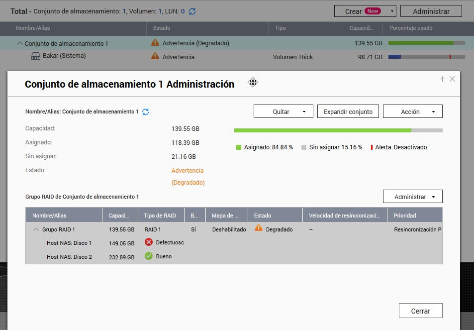 La nas pitará nuevamente y encenderá el led de alarma. En mi caso por el modelo de nas que tengo, se enciende en rojo el del de la primera bahía.