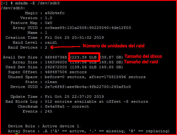 En la imagen vemos la partición inicial del raid es /dev/sda3 y por tanto el disco inicial es el /dev/sda