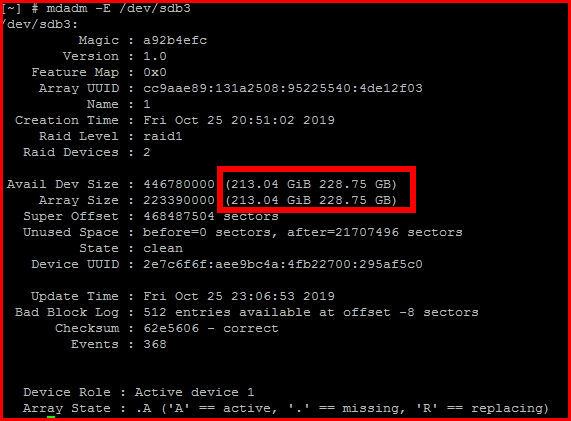Vemos que las cantidades del disco y del raid son coincidentes a 213,04 GB