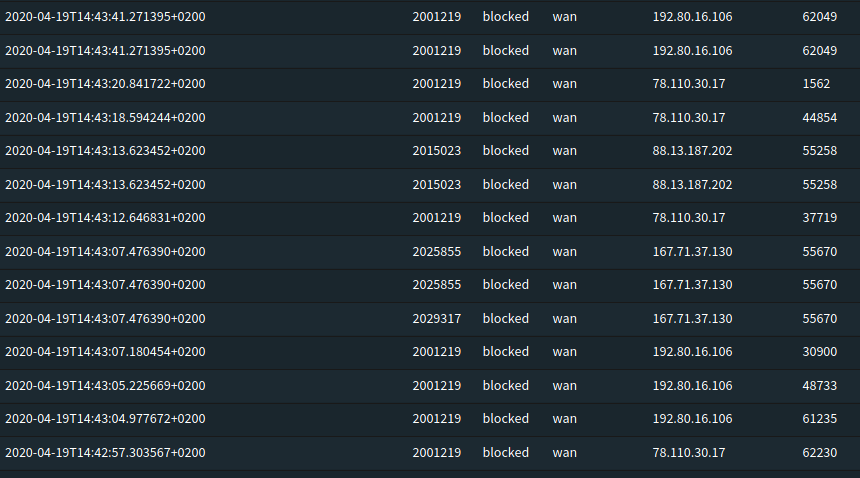 A continuación os pongo el log de mi detector de intrusiones que actua independiente del cortafuegos, o sea, en el mismo periodo de tiempo las ips realmente bloqueadas serían las del cortafuegos más las del detector de intrusiones: