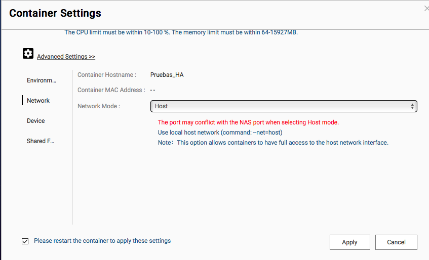 siguiendo un tutorial para de crearlo a la hora de seleccionar network me dice que seleccione HOST como indico en la imagen