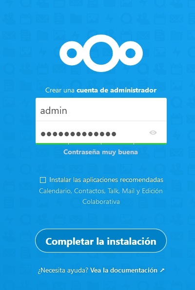 Y si todo ha ido bien cuando escribamos en nuestro navegador web "http://ip_nuestra_nas:1080" se presentará el asistente de creación del usuario administrador de NextCloud