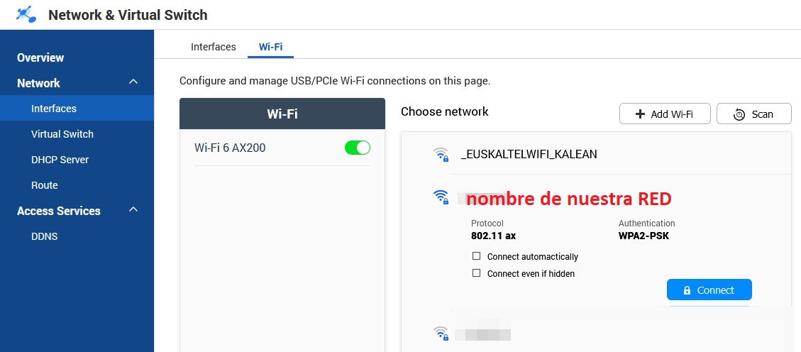 Tras la activación, la tarjeta mostrará las redes que está detectando. Si no está en la lista por ser oculta, pulsamos al botón de "+" para hacerlo manualmente.