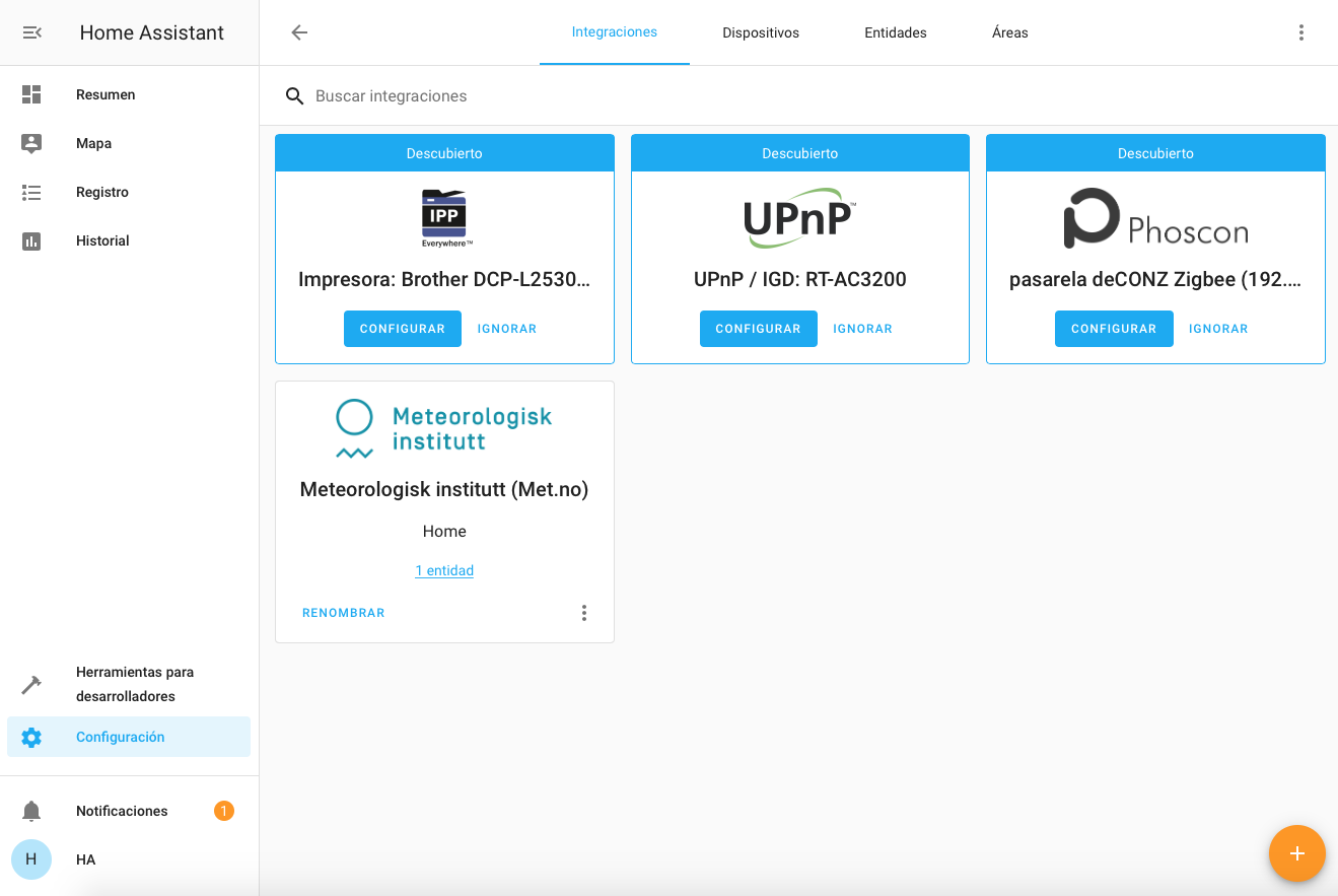 11. Para ir añadiendo elementos nuevos vamos a configuración y seleccionamos integraciones y pulsaremos sobre la tecla + para ir añadiendo mas, en esta pantalla tendremos los elementos que nos han detectado previamente en la instalación, podemos pasar a configurarlos y añadir nuevos