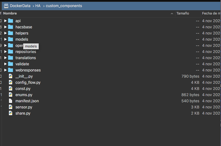descargamos el archivo hacs.zip, lo descomprimimos y lo copiamos a una nueva carpeta que debemos de crear dentro de la carpeta de HA que hemos creado al principio, en mi caso: