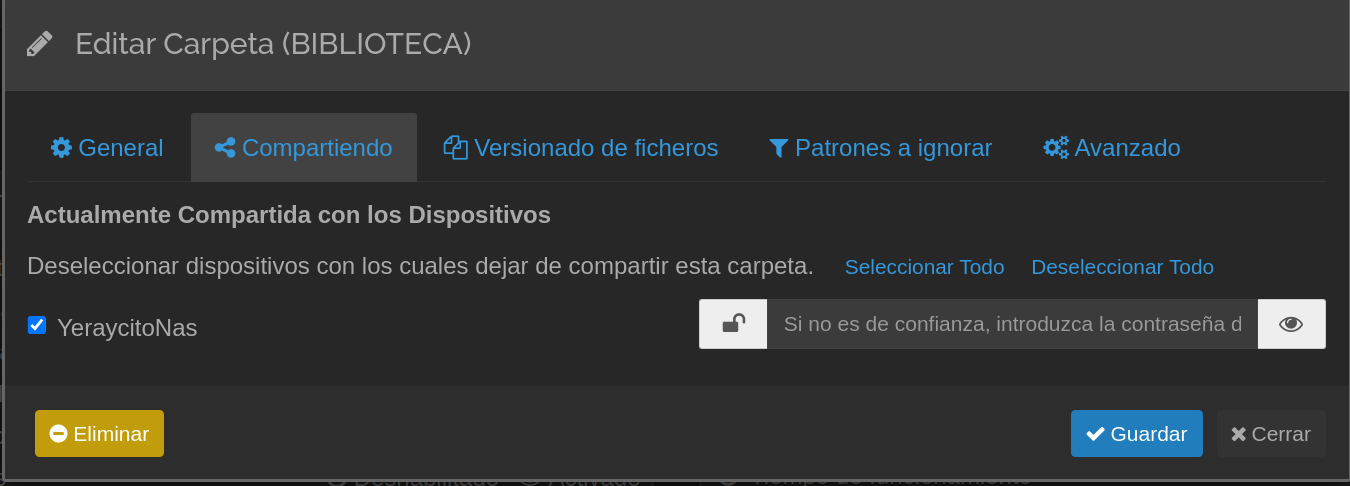 - En la pestaña Compartiendo vemos que tenemos la opción de autorizar la sincronización de esa carpeta con el nas. Es mejor no hacerlo ahora y hacerlo después cuando tengamos la configuración en el nas terminada. Cuando la tengamos terminada podemos ver que nos aparece esa misma opción también en el nas. Teniendo todo configurado en los dos sitios tan sólo tenemos que autorizar la sincronización en uno de los dos lados y si, por ejemplo, la autorizamos en el ordenador veremos a continuación un mensaje en el syncthing del nas en el que se nos pide confirmación para autorizar esa sincronización. Lo mismo ocurre si lo hacemos al revés.