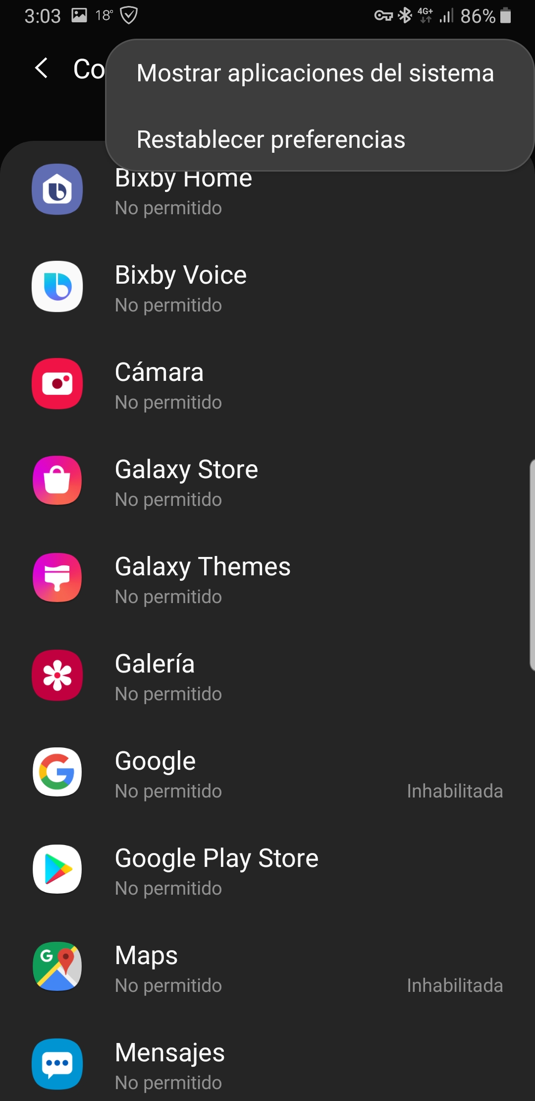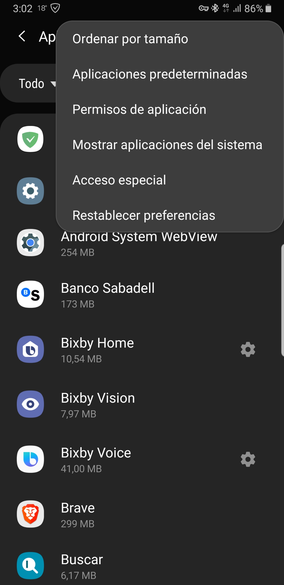 1 - Entramos en la configuración de Android en el apartado Aplicaciones. Al darle ahí nos salen las aplicaciones instaladas en nuestro móvil y en la parte superior derecha vemos que hay una barra vertical que si le damos nos aparece lo siguiente: