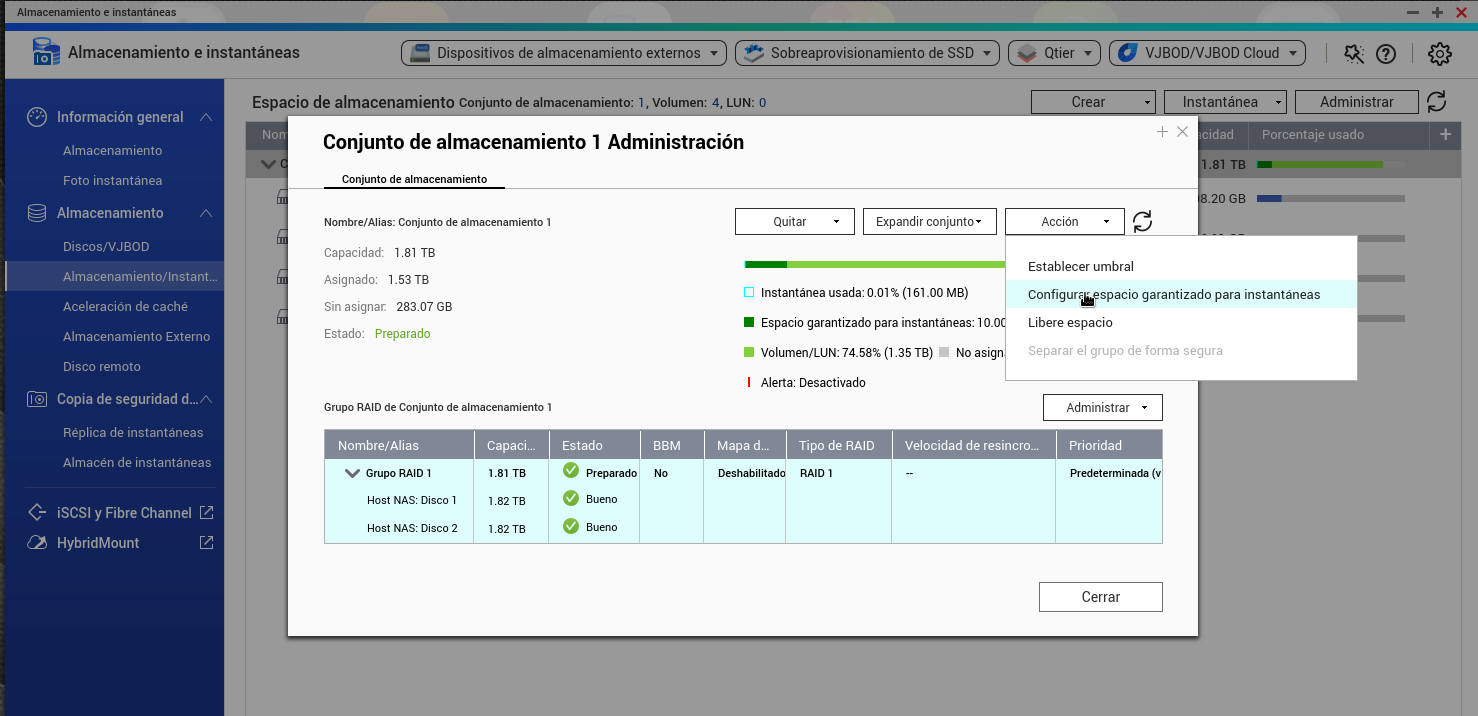 - En el conjunto de almacenamiento dejar 600 gigas reservadas para instantaneas y 100 gigas sin asignar