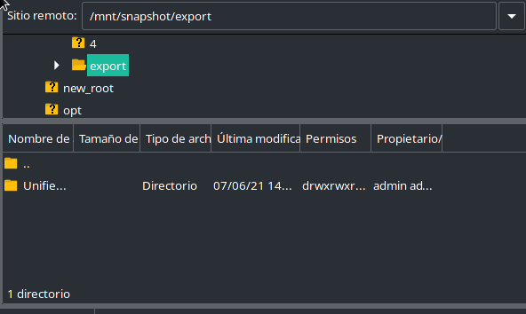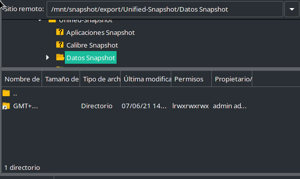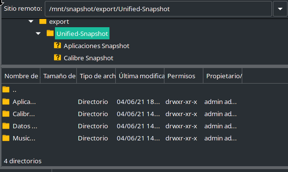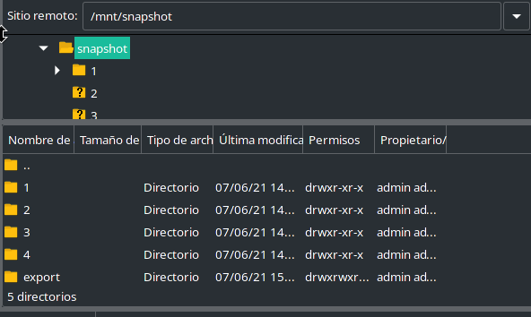 Lo que se ve en la imagen son 4 carpetas numeradas ( en mi nas tengo 1 conjunto de almacenamiento y 4 volúmenes y de cada uno de esos volúmenes tengo 1 intantanea ) y una carpeta llamada export. Dentro de esa carpeta export hay otra carpeta llamada Unified-Snapshot y dentro de ella 4 carpetas con el nombre de los 4 volúmenes que tengo en mi nas: