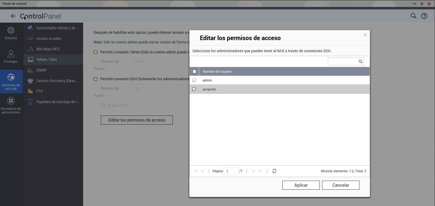 Para terminar una curiosidad. Creo recordar que antes el acceso por ssh al nas sólo estaba permitido a la cuenta admin. Ahora puede acceder cualquier cuenta siempre y cuando se autorice. Esto último se puede hacer desde el Panel de Control del nas editando los permisos de acceso: