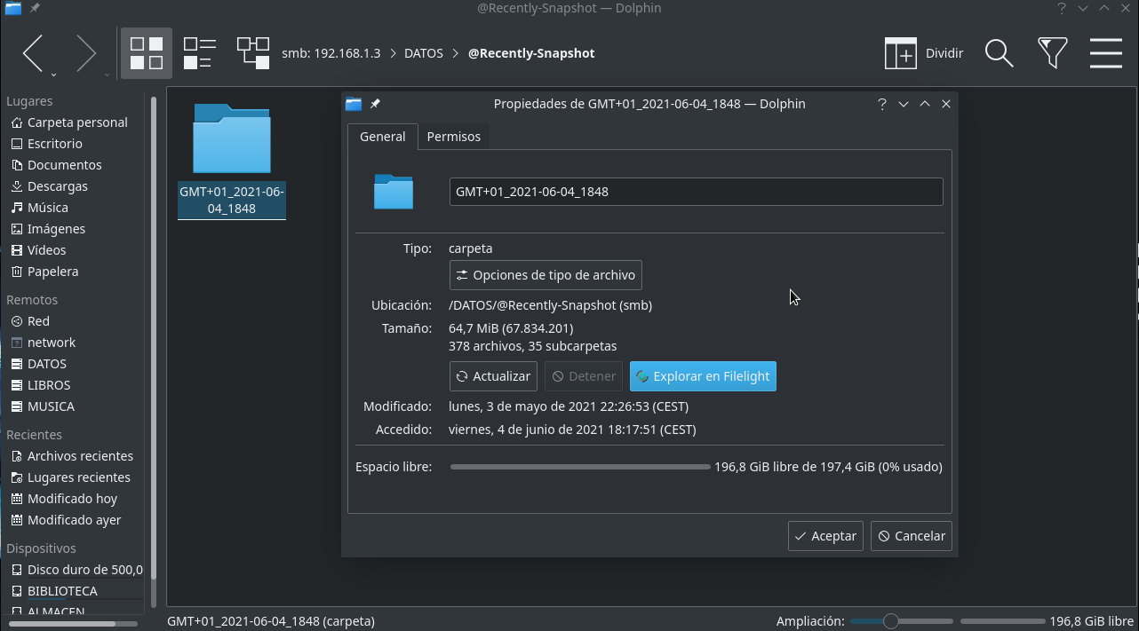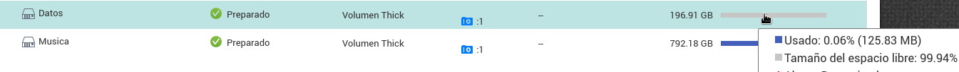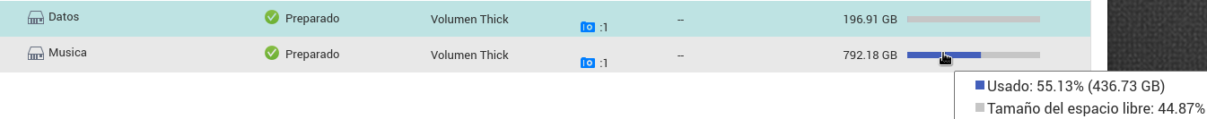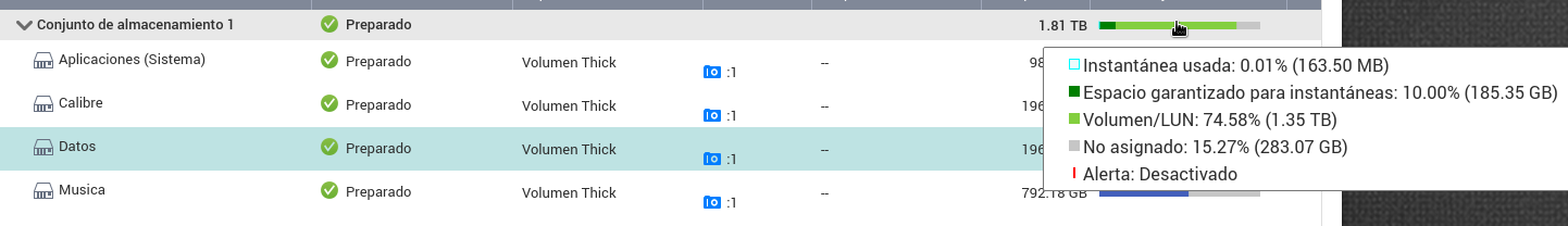 Si hacemos caso a lo explicado en el ejemplo del volumen Datos la instantánea del volumen Música ocuparía cerca de la mitad del espacio real que ocupan los datos en el nas. En este caso esa intantanea debería ser de 120 gigas aproximádamente. De hecho puedo asegurar que esa instantanea ocupa ese espacio porque empecé a copiarla al ordenador aunque no llegué a copiarla del todo y más o menos son esos datos.