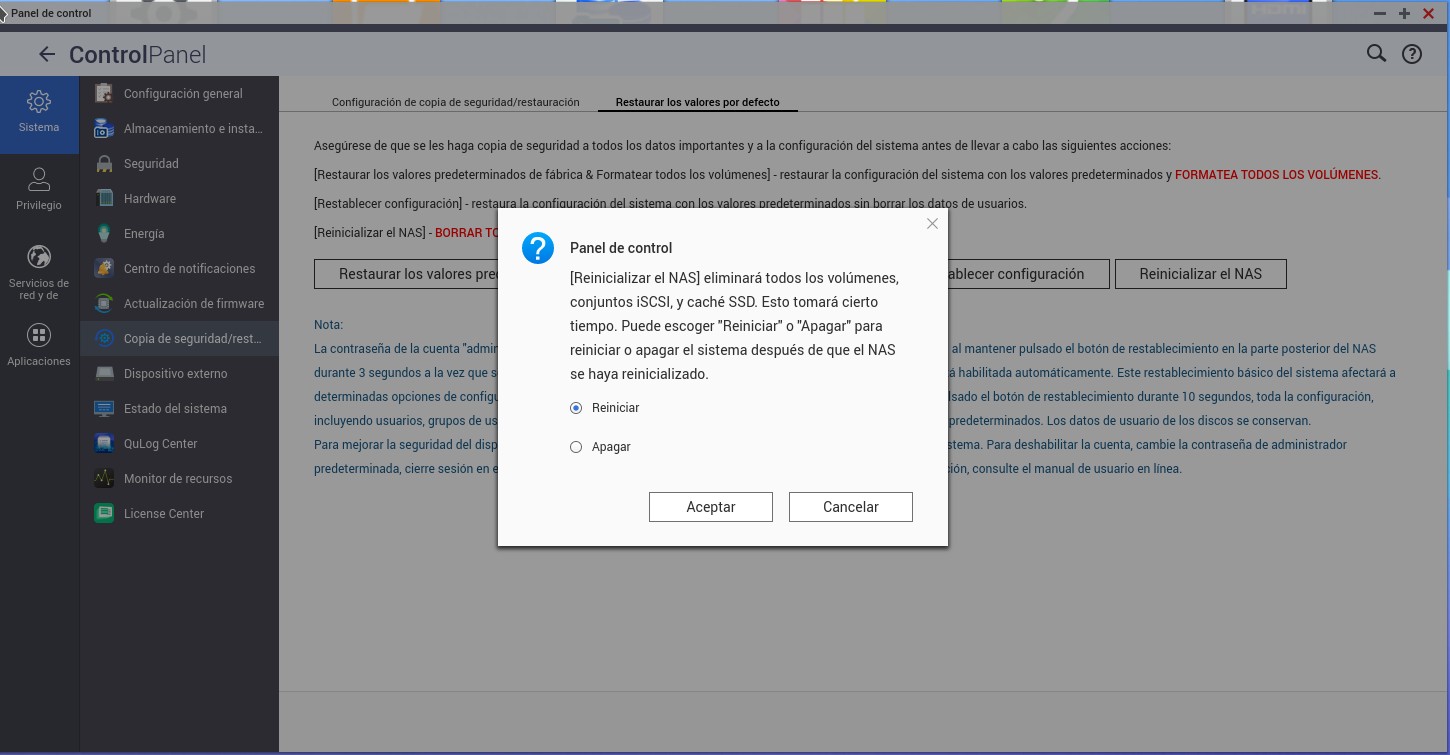 Para reinicializar el nas se puede hacer también de dos maneras: