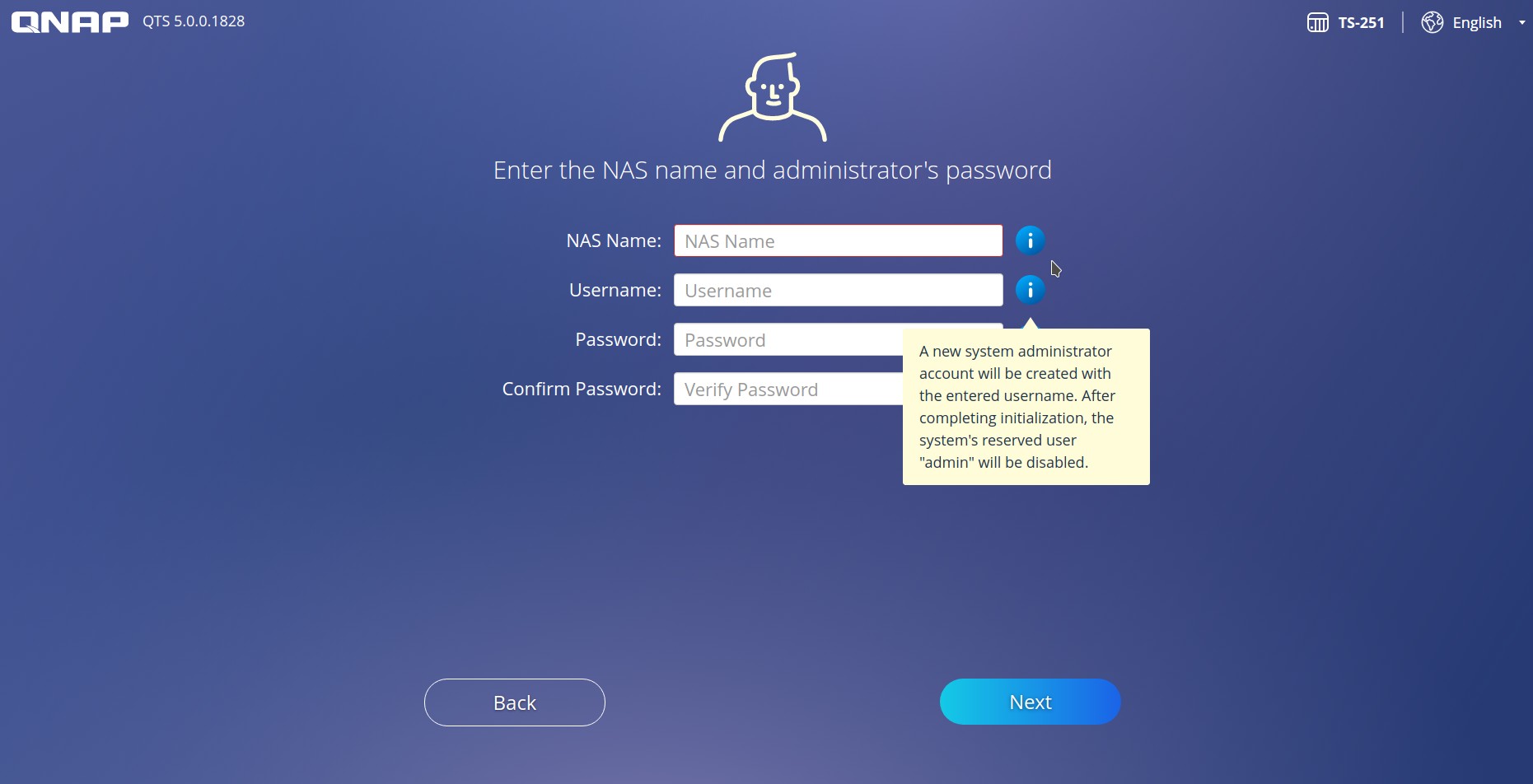Se nos pide el nombre del nas, nombre de usuario y contraseña de administrador. Si pulsamos en el botón de ayuda correspondiente al cuadro de nombre de usuario se nos informa que se va a crear una cuenta de administrador con ese nombre que pongamos y también se nos dice que cuando la instalación termine la cuenta admin quedará dehabilitada. Lo explico de otra manera. Al poner el nombre de usuario y la contraseña que queramos esas serán las credenciales futuras de acceso al nas, es decir, accederemos al nas cómo un usuario normal y, a pesar de lo que dice antes, NO COMO ADMINISTRADOR ya que la cuenta admin se crea pero no está habilitada por seguridad.